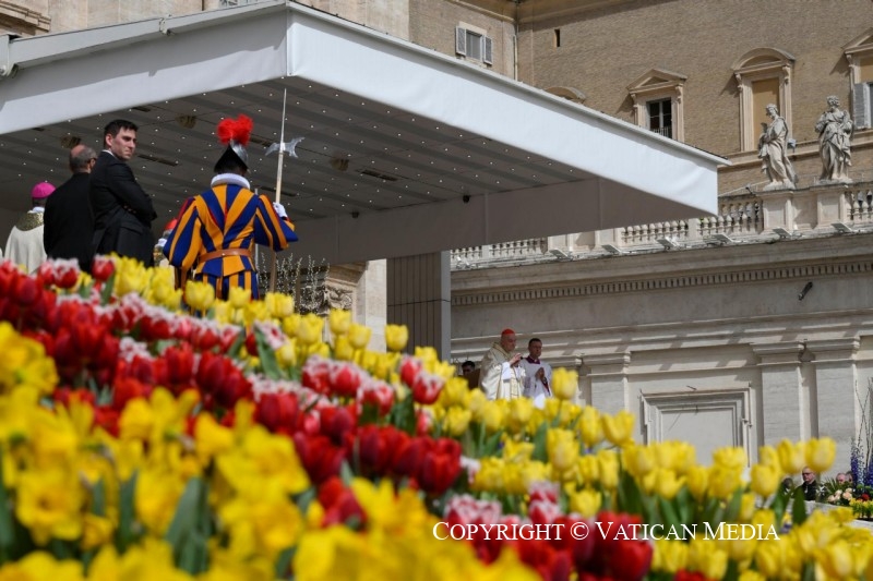 On Sunday, the work begins at dawn, before the opening of the Square to the faithful, with the positioning of the olive branches, which are delivered to the faithful. At the same time, a team of florists and gardeners prepare the woven palms on the tables provided, which will be used by the Holy Father, Bishops and Cardinals during the solemn procession, which starts from the Bronze Door and culminates at the Obelisk. Two different moments must be specified. The first is during the Easter Vigil, which is celebrated at the Altar of the Confession inside St. Peter's Basilica. In this case, the floral decorations are made by florists and gardeners employed by the Governorate with the support of volunteers. Instead, for the Easter Sunday decorations, the flowers and the arrangements are donated by the Dutch master florists of Holland.
