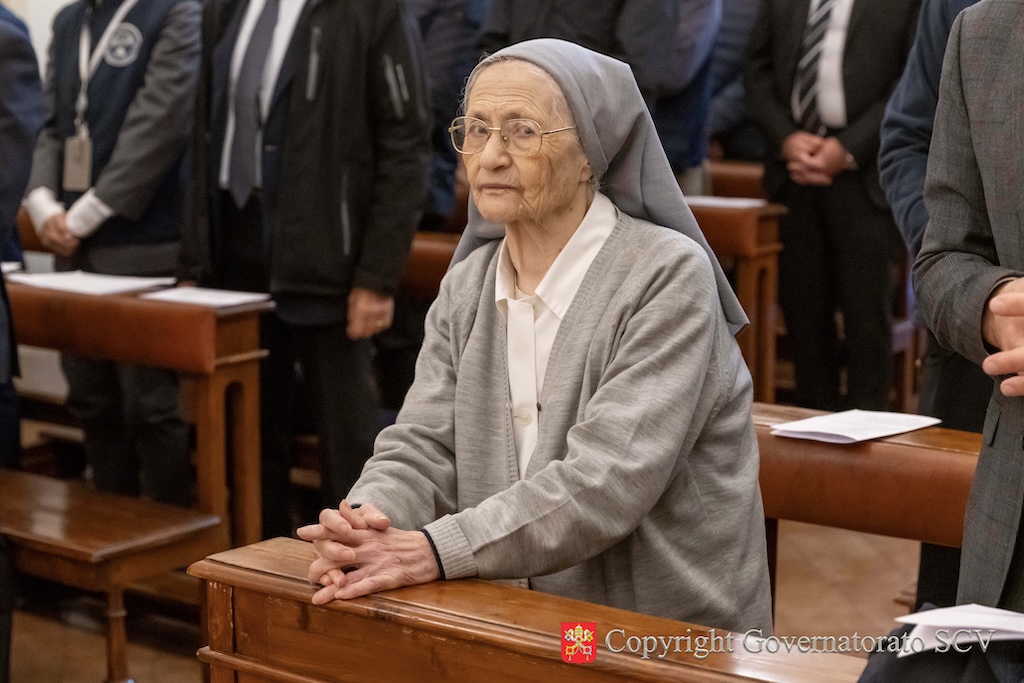 The religious sisters serve in the Tapestry and Textile Restoration Laboratory of the Vatican Museums. Concelebrating with Monsignor Nappa was Augustinian Father Bruno Silvestrini, chaplain of the Directorate of Infrastructure and Services.