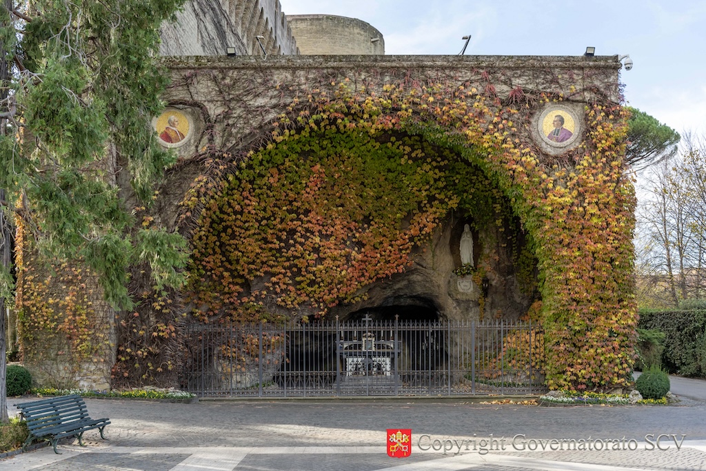 Para recordar las apariciones, en los Jardines Vaticanos se erigió una copia fiel de la Gruta de Lourdes, que se asoma a la plaza homónima. Fue León XIII quien, en 1902, solicitó a monseñor François-Xavier Schoepfer, obispo de Tarbes —en cuya diócesis se encuentra Lourdes—, la reproducción, a escala reducida, del santuario mariano tal como se presentaba en aquel tiempo. La estatua de mármol que se halla en la hornacina es semejante a la realizada por Joseph Fabisch en 1864. Representa a la Virgen tal como la describió Bernadette en la aparición del 25 de marzo de 1858 cuando, respondiendo a la pregunta de la joven que le pidió su nombre, la Virgen, con las manos juntas y elevando los ojos al cielo, dijo: «Yo soy la Inmaculada Concepción».