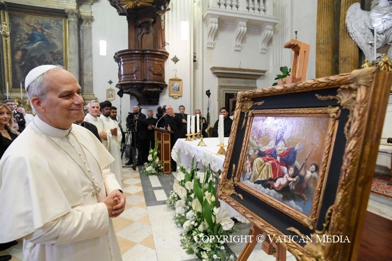 À la fin de la Messe, la paroisse a tenu à offrir un hommage symbolique au Pape : une reproduction du tableau représentant saint Thomas de Villeneuve, placé sur l’autel latéral droit de l’église.