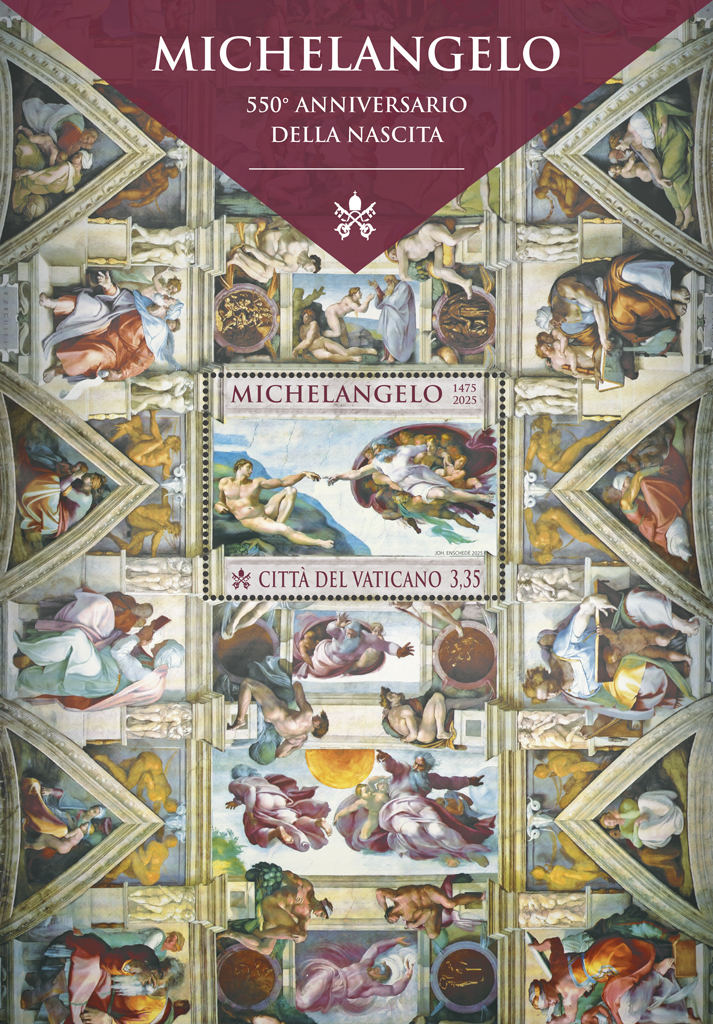 Dans le cadre du Jubilé 2025, la Poste vaticane célèbre le 550ᵉ anniversaire de la naissance de Michel-Ange avec un bloc-feuillet philatélique de grand prestige. Ses œuvres présentes dans la Cité du Vatican – de la Chapelle Sixtine au Jugement dernier, jusqu’à la coupole de Saint-Pierre – témoignent du lien indélébile entre l’art et la foi.