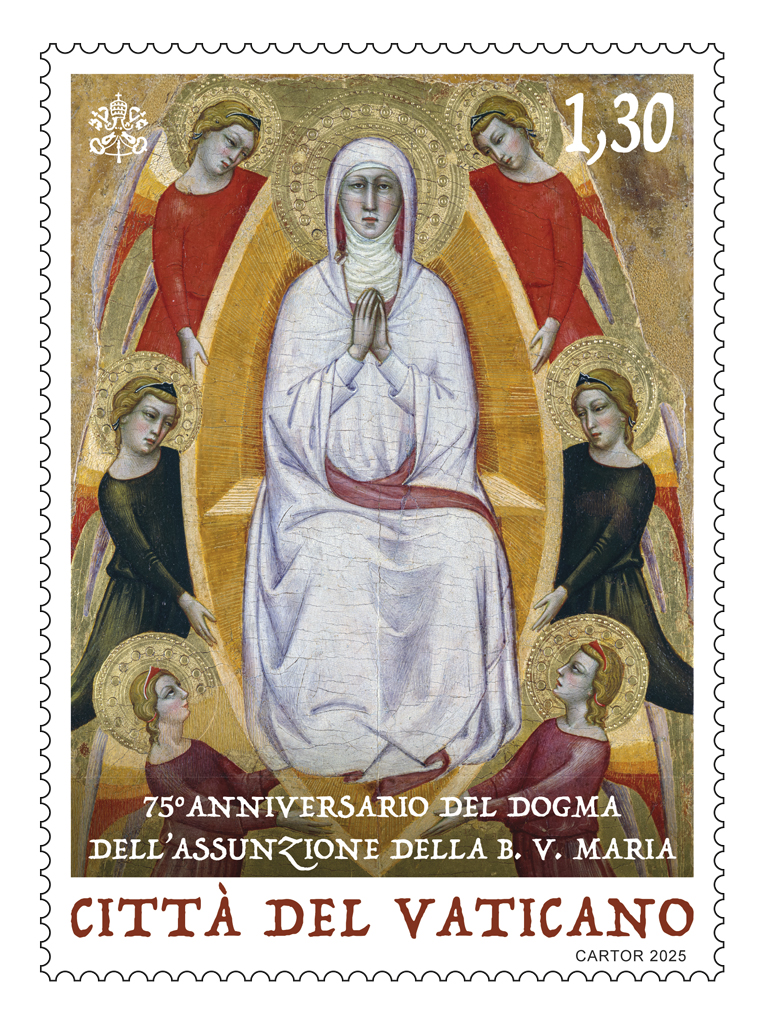 Un timbre spécial est émis en souvenir de la proclamation du Dogme de l’Assomption de la Bienheureuse Vierge Marie par le Pape Pie XII le 1ᵉʳ novembre 1950. Le Dogme, contenu dans la constitution apostolique Munificentissimus Deus, met en lumière la glorification de Marie corps et âme, Reine du ciel et modèle d’espérance.