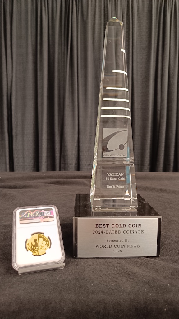 La Monnaie de l’État du Vatican célèbre avec fierté une importante reconnaissance internationale : la pièce d’or de 50 euros « Guerre et Paix », frappée en 2024, a remporté le prix Best Gold Coin aux COTY Awards 2025, décernés le 21 août lors de la World’s Fair of Money à Oklahoma City, aux États-Unis.
