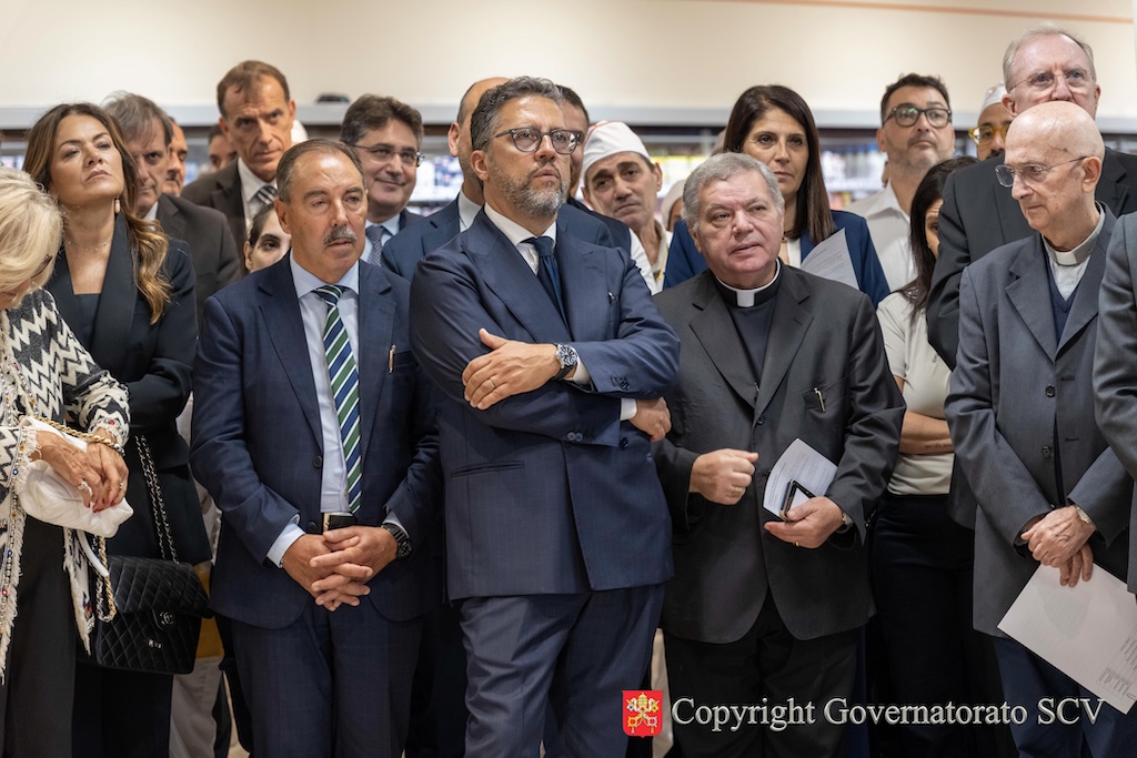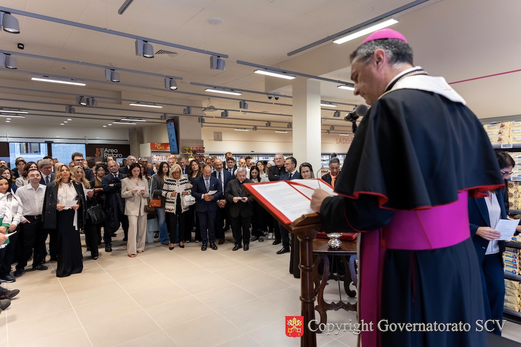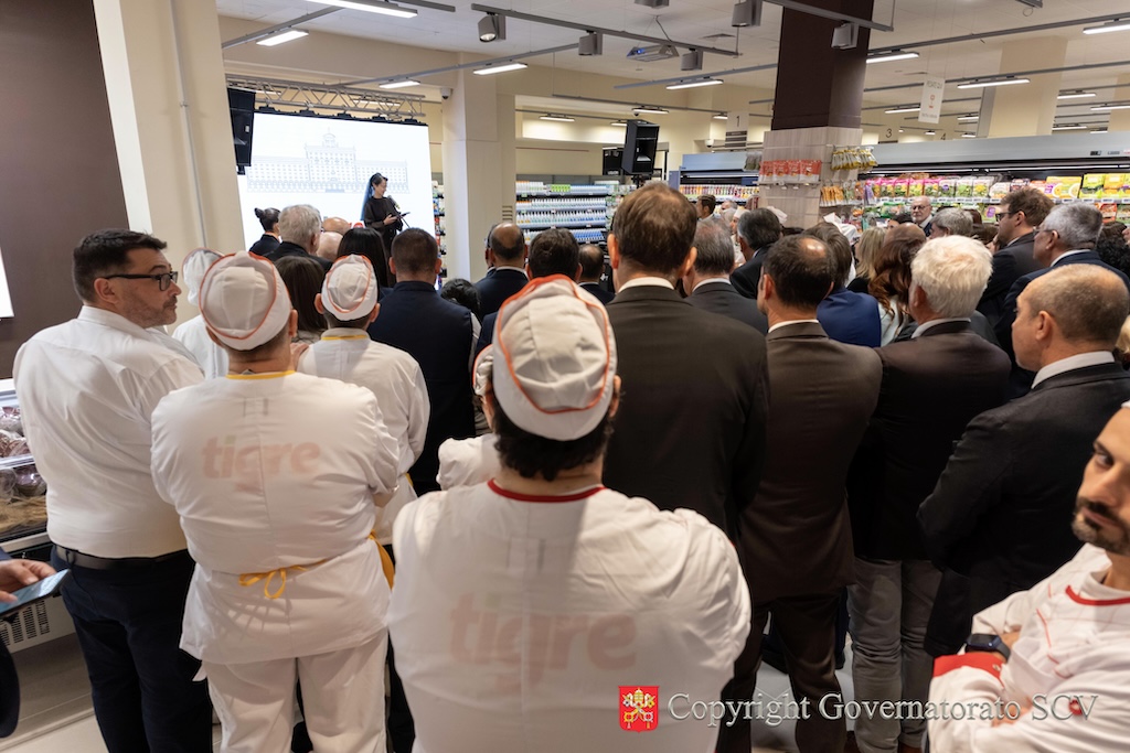 La cérémonie officielle d’inauguration et de bénédiction des locaux a eu lieu dans l’après-midi du mardi 14 octobre. Étaient présents, entre autres, Sœur Raffaella Petrini, S.Exc. Mgr Emilio Nappa et l’avocat Giuseppe Puglisi-Alibrandi, respectivement Présidente et Secrétaires généraux du Gouvernorat, le Cardinal Arthur Roche, Préfet du Dicastère pour le Culte divin et la Discipline des Sacrements, S.Exc. Mgr Luciano Russo, Secrétaire de la Section pour le Personnel de Carrière diplomatique du Saint-Siège, Laura Gabrielli, Présidente de Magazzini Gabrielli S.p.A., gestionnaire du point de vente sous la nouvelle enseigne « Tigre-Annona », accompagnée de membres de sa famille et d’associés du Groupe. Ont également participé les Directeurs et Vice-Directeurs des diverses Directions du Gouvernorat, en particulier Enrico Bartelucci et Nicola Francescucci, respectivement Directeur et Vice-Directeur du Secteur des activités économiques de la Direction de l’Économie, ainsi que l’ingénieur Salvatore Farina, Directeur de la Direction des Infrastructures et des Services.