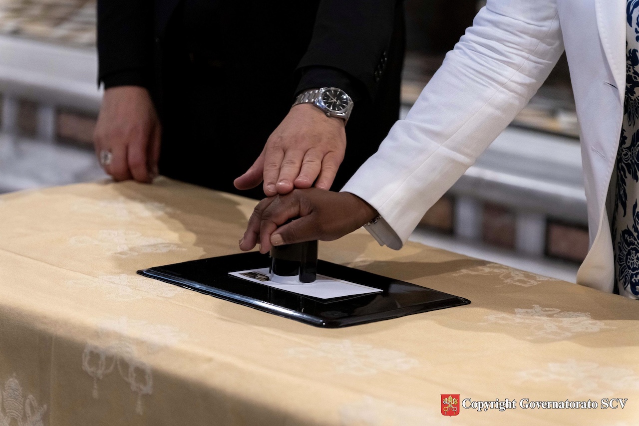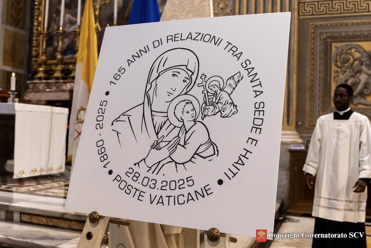 Nel pomeriggio, nella cappella del Coro della Basilica di San Pietro, il Cardinale Peter Kodwo Appiah Turkson, Cancelliere della Pontificia Accademia delle Scienze e della Pontificia Accademia delle Scienze Sociali, ha presieduto la concelebrazione eucaristica. Successivamente, l’Arcivescovo Emilio Nappa, Segretario Generale del Governatorato, insieme con l’Incaricata d’affari dell’Ambasciata di Haiti presso la Santa Sede, Sig.ra Marie Guerlyne Janvier, ha svelato l’annullo postale speciale, in occasione del 165° anniversario del concordato tra la Santa Sede e la Repubblica di Haiti. L’annullo riproduce un particolare dell’effigie di Nostra Signora del Perpetuo Soccorso, con l’angelo che mostra al Bambino gli strumenti della Passione. Completano l’annullo le scritte “165 Anni di relazioni tra Santa Sede e Haiti”, “28.03.2025” e “Poste Vaticane”. Era presente anche l’ingegner Antonino Intersimone, Direttore della Direzione delle Telecomunicazioni e dei Sistemi Informatici.