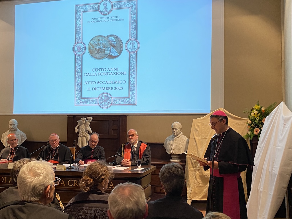 Oggi siamo qui per ricordare un importante anniversario di questo Istituto di Archeologia Cristiana, la cui fondazione avvenne, ufficialmente, proprio l’11 dicembre di cento anni fa, sotto gli auspici di Papa Pio XI e grazie all’impegno profuso dal prelato e studioso lussemburghese Johann Peter Kirsch che, da queste aule, diede un contributo, di portata storica, allo sviluppo del metodo e all’affermazione internazionale dell’allora nascente disciplina dell’archeologia cristiana, intesa nella sua funzione di indagine allargata a tutte le manifestazioni della vita cristiana, dai primi secoli fino al Medioevo.