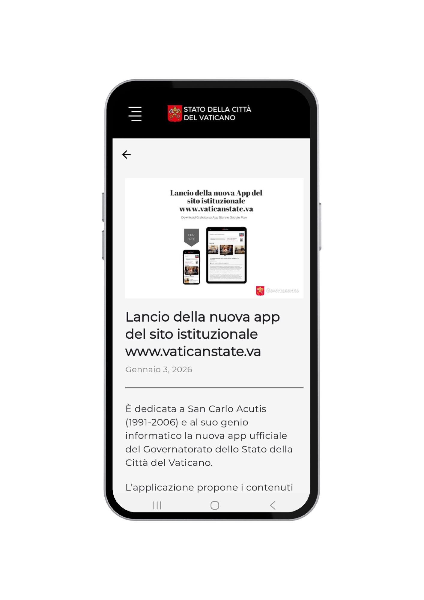 Si rivolge a tutte le persone interessate a seguire la vita e le attività istituzionali dello Stato della Città del Vaticano attraverso un canale ufficiale, diretto e affidabile di informazione. È la nuova app lanciata lo scorso 3 gennaio per rendere più fruibili sui dispositivi mobili i contenuti del sito istituzionale www.vaticanstate.va.