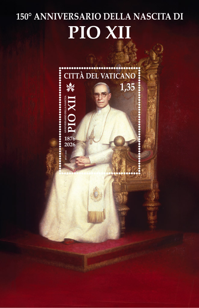 Per celebrare il 150° anniversario della nascita di Eugenio Pacelli, il Servizio Poste e Filatelia propone un foglietto e un annullo postale speciale die emissionis. Pacelli fu Pontefice dal 1939 al 1958, con il nome di Pio XII e guidò la Chiesa in uno dei periodi più drammatici del Novecento. Si distinse per l’intensa attività diplomatica durante il secondo conflitto mondiale e per un magistero dottrinale di rilievo, segnato in particolare dalla proclamazione del dogma dell’Assunzione nel 1950.