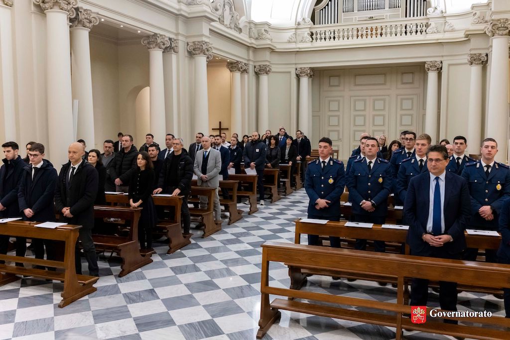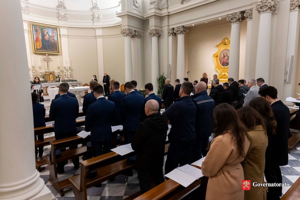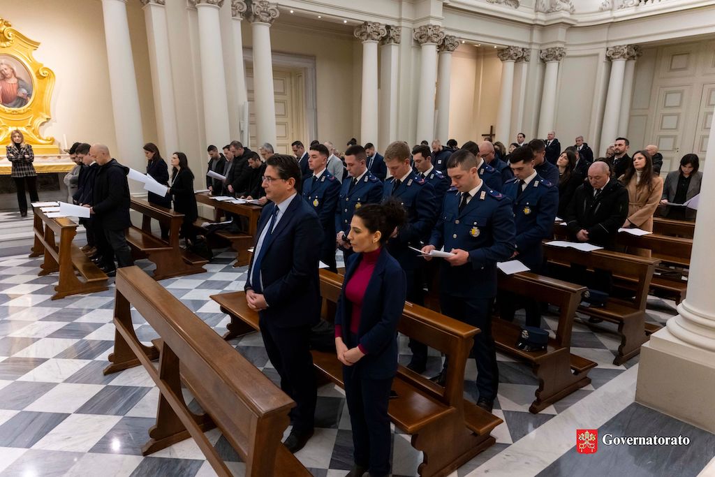 The profession of faith and the oath of fidelity are two important events in the lives of the employees of the Governorate, which occur after they are hired on a trial basis. Cardinal Fernando Vérgez Alzaga, President of the Governorate of Vatican City State, presided at the so-called swearing ceremony on Thursday morning, 13 February, in the Governorate’s Church of Mary, Mother of the Family. Also present were Sister Raffaella Petrini, Secretary General of the Governorate, and a number of Directors.
