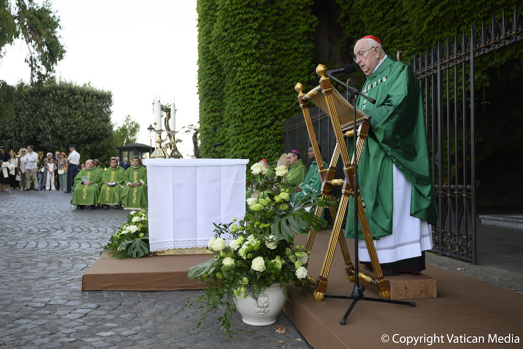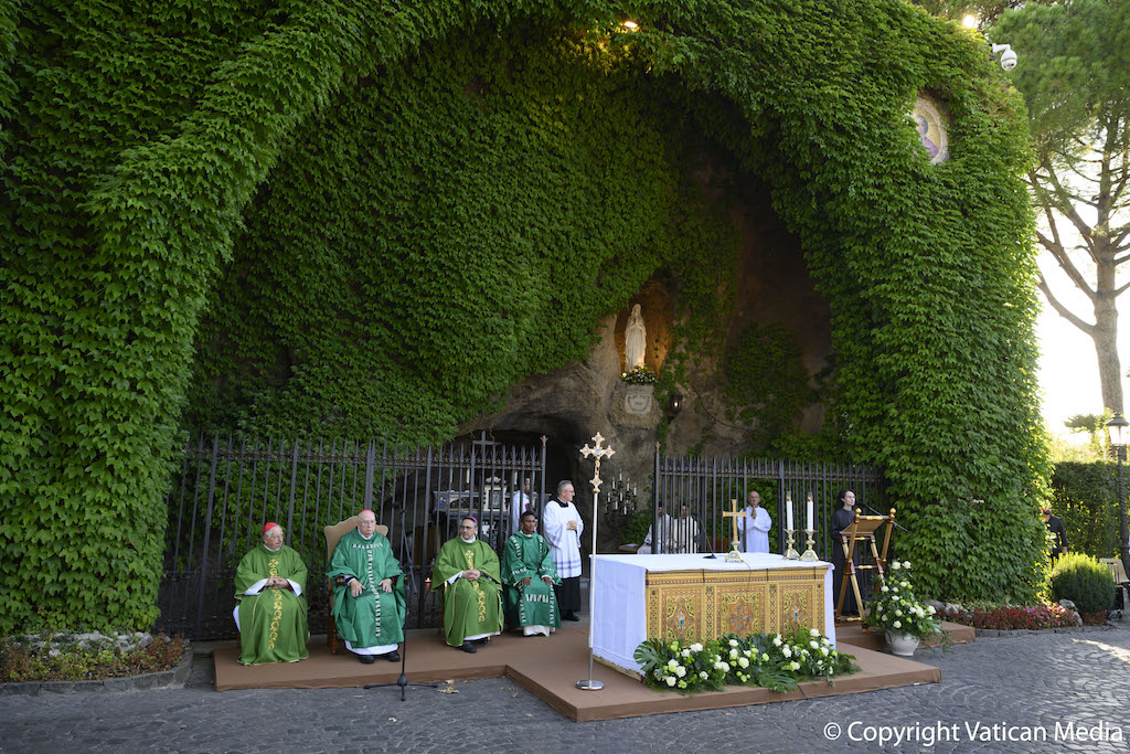 Before the Pope’s arrival, Cardinal Fernando Vérgez Alzaga had presided over the Eucharistic Concelebration at the Grotto of Lourdes. Among the concelebrants were Cardinal Giuseppe Bertello and Archbishop Emilio Nappa. Father Franco Fontana, Coordinator of the Chaplains of the Directorates and Central Offices, led the liturgy.
