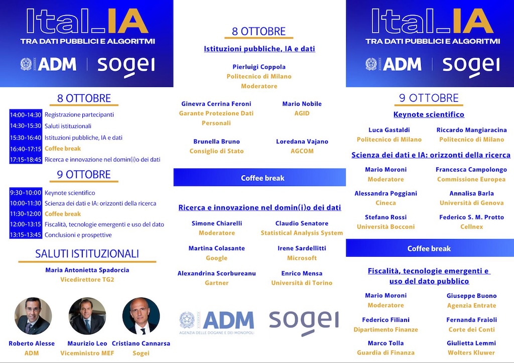 On October 8 and 9, the conference “Ital_IA – Between Public Data and Algorithms” was held in the Carassa-Dadda Auditorium of the University Politecnico di Milano. The event was promoted by the Italian Customs and Monopolies Agency and Sogei (General Information Technology Company), with the scientific contribution of the Politecnico di Milano. It consisted of two days of discussion dedicated to the role of Artificial Intelligence and public data in decision-making processes and in services for citizens and institutions.