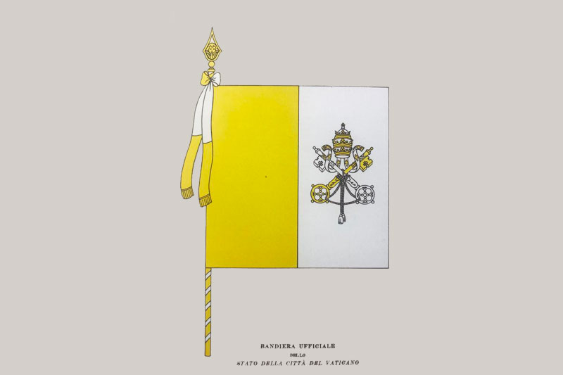 In the past, the flag of the Papal States was yellow and red (to be precise reddish rose, the colours of the Holy See’s coat of arms), the two colours that were traditionally used by the Roman Senate and the people of Rome. They were substituted with white and yellow in 1808, when Pius VII ordered his Noble Guard and the other armed corps that had remained loyal to him, to adopt a new cockade with the said colours, to distinguish them from the remaining troops that had been incorporated into the French army, who were permitted by General Sestio A. F. Miollis to use their old cockade.