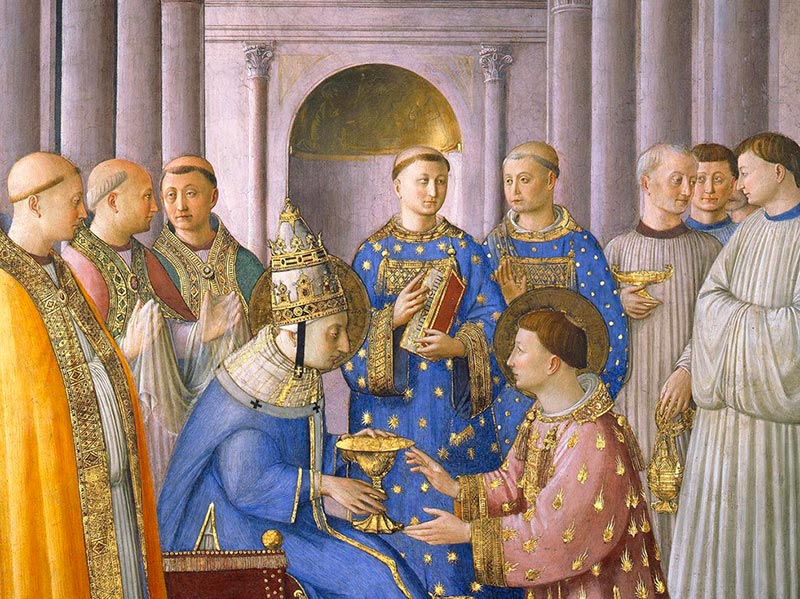 While working at the service of the Popes, Fra Angelico painted frescoes on the “Stories of Christ”, in the Chapel of the Holy Sacrament, known as “parva”, in 1446, which were destroyed during the time Pontificate of Paul III. After the death of Eugene IV on 23 February 1447, his successor, Nicholas V, commissioned him to paint frescoes in the Apostolic Palace’s Chapel that bears his name: the Niccoline Chapel. With the approval of the Pope, he travelled to Orvieto on 11 May 1447, to work on the ceiling of the Chapel of San Brizio in the city’s Cathedral. He then returned to Rome to finish painting the Niccoline Chapel, which he completed in 1448. Two years later, he went back to Florence and was appointed Prior of the Dominican Convent in Fiesole, a position held for two years, before returning to Rome again in 1452 to complete some paintings in Santa Maria Sopra Minerva. He died and was buried at the Convent in February 1455.