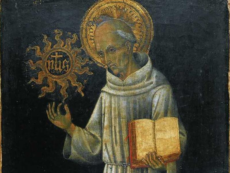 Recorrió la Italia de su tiempo predicando e invitando a la conversión, a la reconciliación y al regreso a Dios. Fue un apóstol de la devoción al Nombre de Jesús, que condensó en el trigrama “IHS”, inscrito en el interior de un sol con doce rayos. Es Bernardino de Siena, fraile menor de la Observancia, quien procuró, en primer lugar, reconducir a sus conciudadanos a la amistad con Dios, y después, a las multitudes que acudían a escuchar sus sermones en toda la Península.