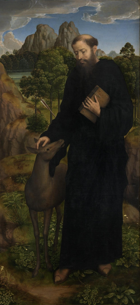 Todavía hoy, los detalles de esta historia se reflejan en la iconografía del santo: aparece como un anciano de larga barba, vestido con hábito monástico y con el báculo abacial, siempre acompañado de la cierva. En ocasiones también se representa la flecha que lo hirió.