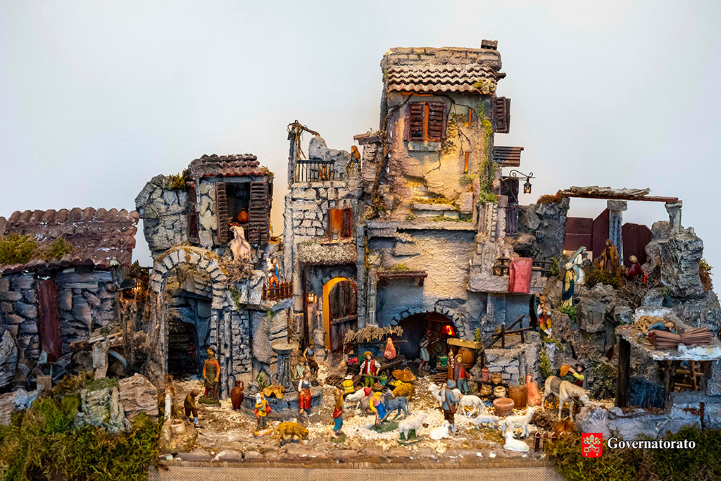 El belén está habitado por muchos personajes, protagonistas de la escena navideña. Lo mismo sucedió en 1223, cuando los habitantes de Greccio participaron en la primera representación de la Natividad, promovida por San Francisco de Asís. Hoy, como entonces, esos pastores, esas mujeres y hombres retratados en su vida cotidiana, pero también los espectadores, se maravillan ante el nacimiento del Niño que salvará al mundo.