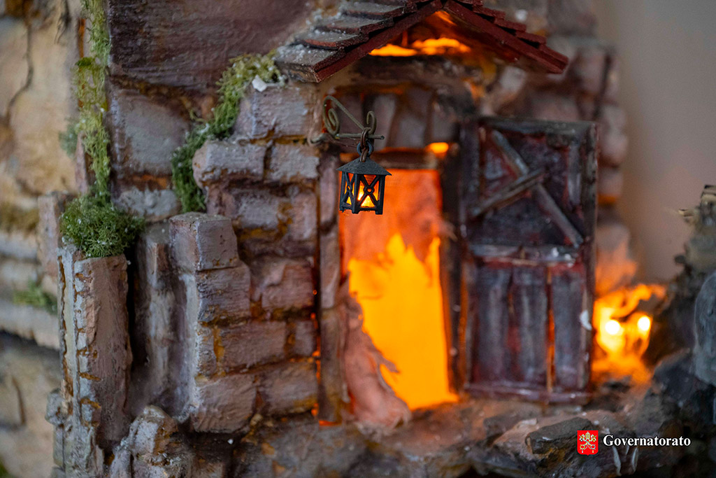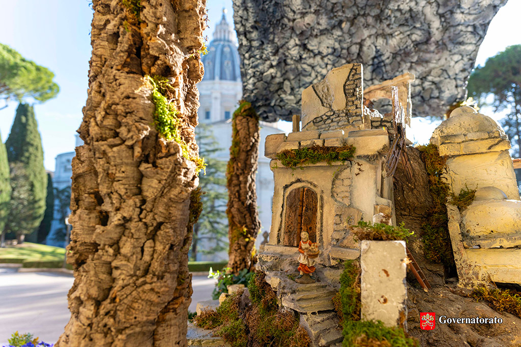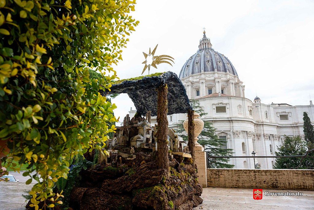 Sobre la cubierta del belén, una gran estrella, similar a una veleta, indica con precisión el lugar donde se encuentra el Salvador: en medio de la cotidianidad, donde no solo la creación se convierte en escenario, sino también los materiales utilizados por el hombre, incluidos los desechos reciclados. De hecho, los creadores del belén han empleado no solo poliestireno y corcho, sino también restos y sobrantes de embalajes y cartones, recuperados en la isla ecológica de los Jardines Vaticanos.