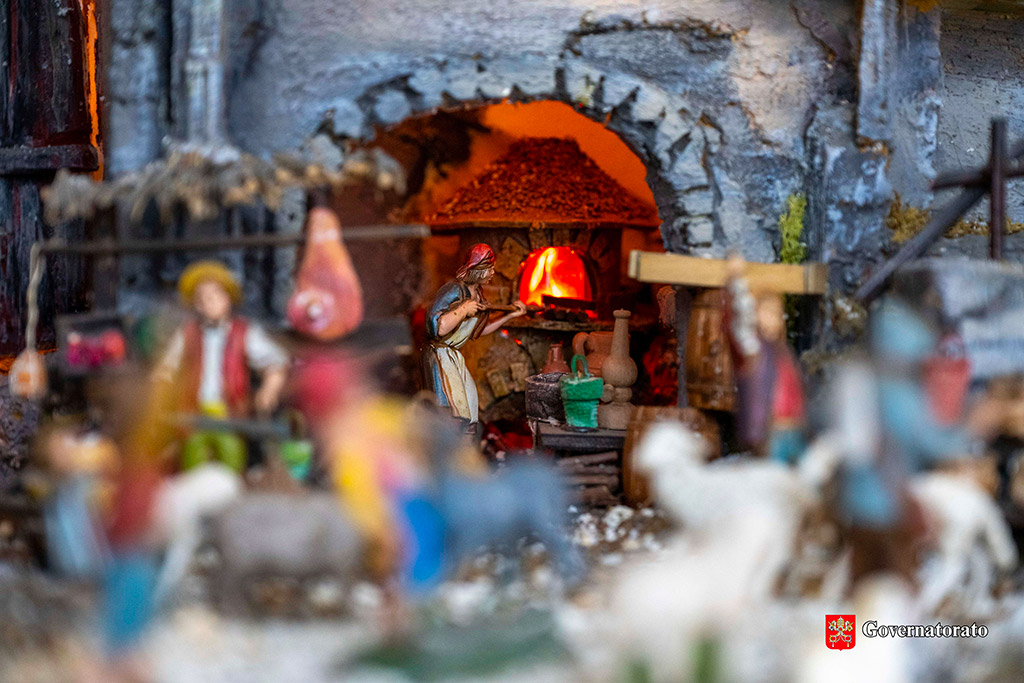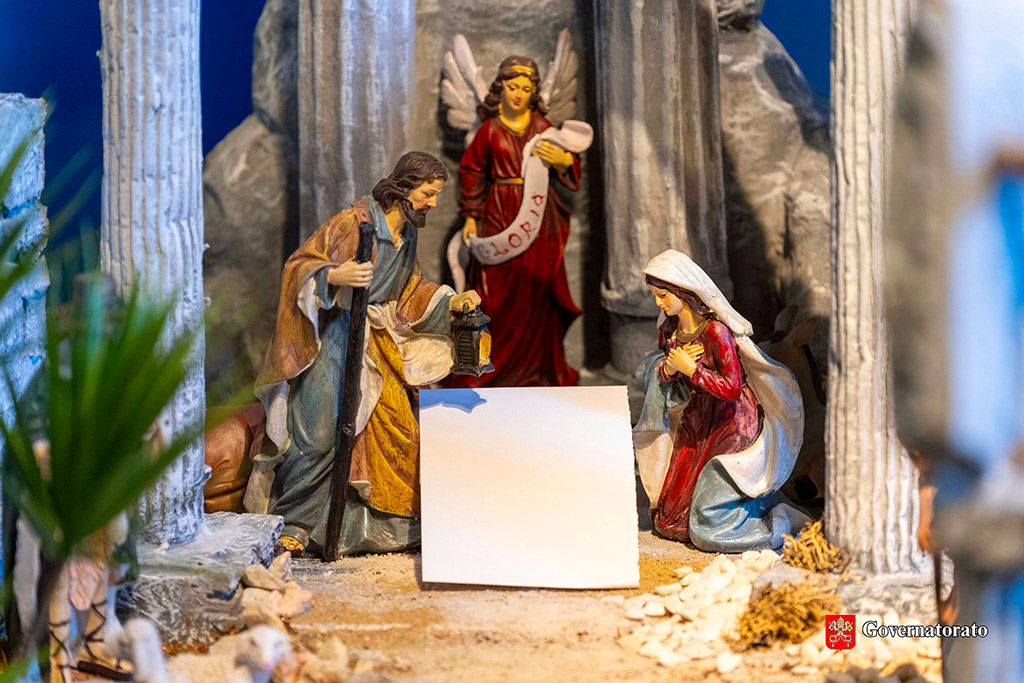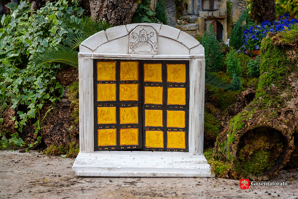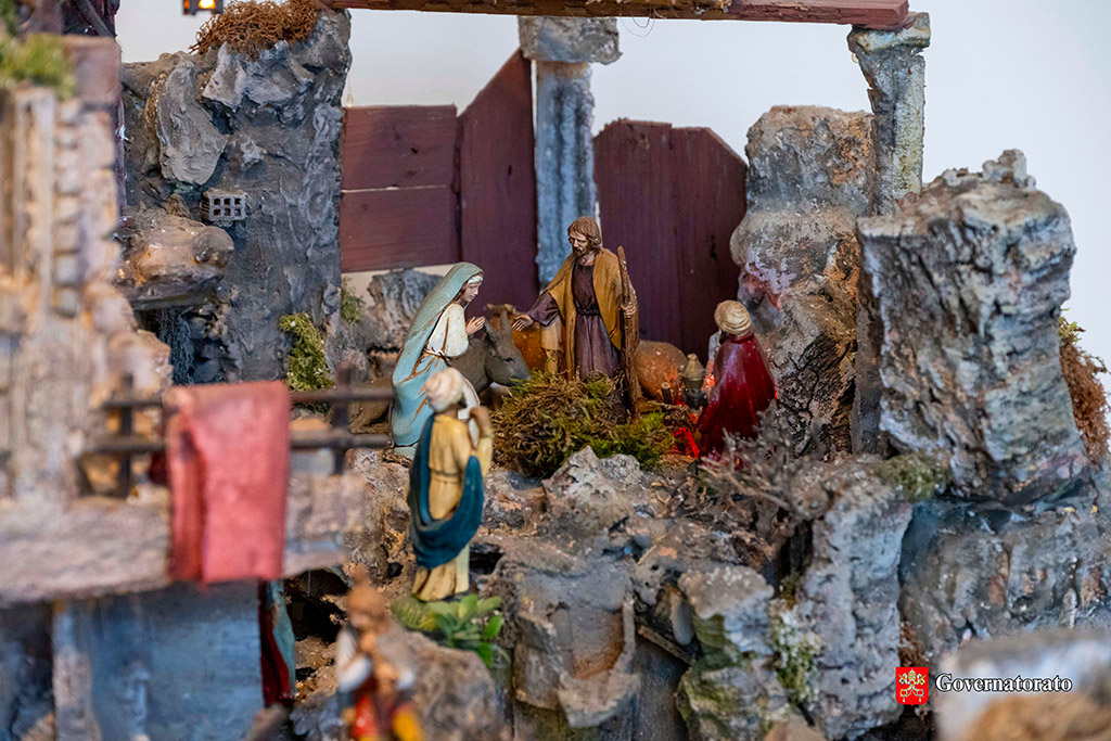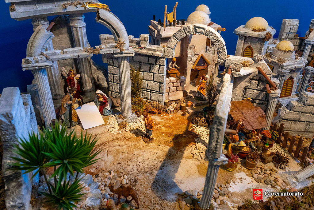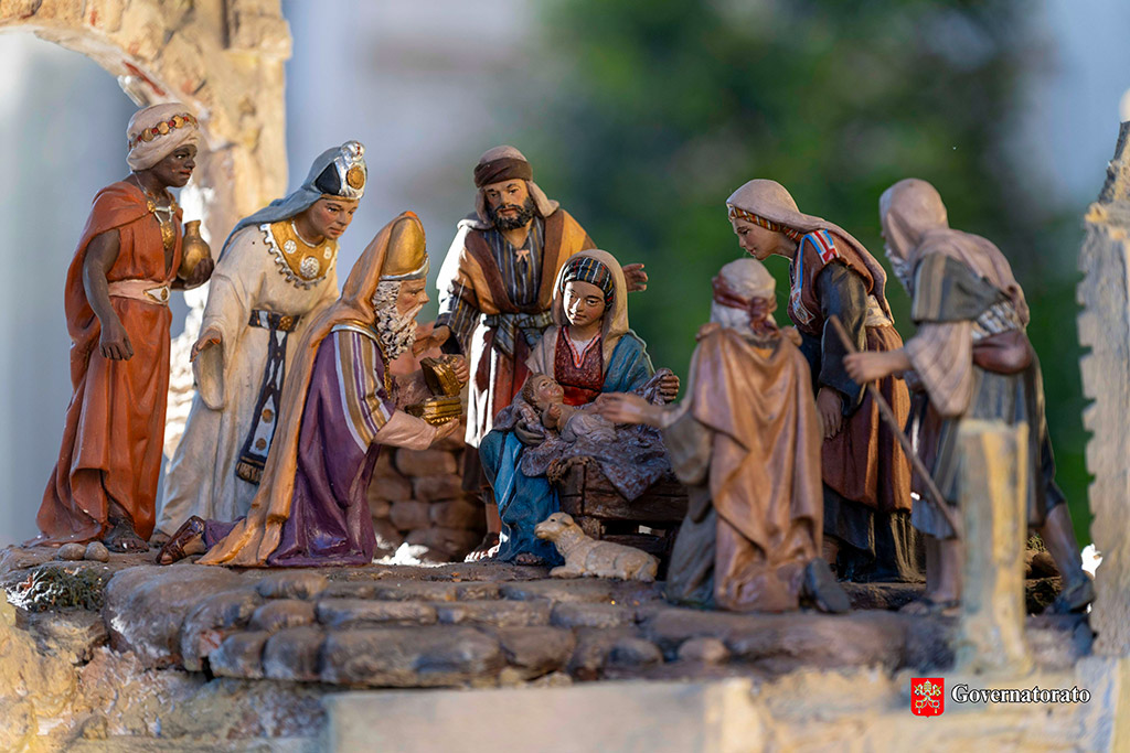 El Jubileo, con la representación de la Puerta Santa entreabierta, es el tema central de la escenificación de la Natividad, expuesta frente a la entrada del Palacio en la Gobernación. Se trata de un belén con una singularidad especial: puede contemplarse desde cualquier ángulo, ya que sus creadores —Augusto Minosse, Andrea Carlino y Fabio Frezza, del Servicio de Jardines y Medio Ambiente de la Dirección de Infraestructuras y Servicios— lo han concebido como una obra de 360 grados. La estructura se alza sobre una roca, en una colina elevada. Está protegida por una cubierta de madera y gomaespuma de colores. Justo debajo, se encuentra el grupo principal de María, José y el Niño, rodeados por pastores y Reyes Magos.