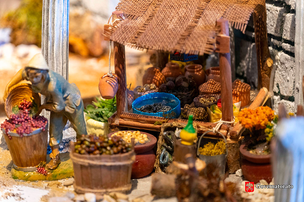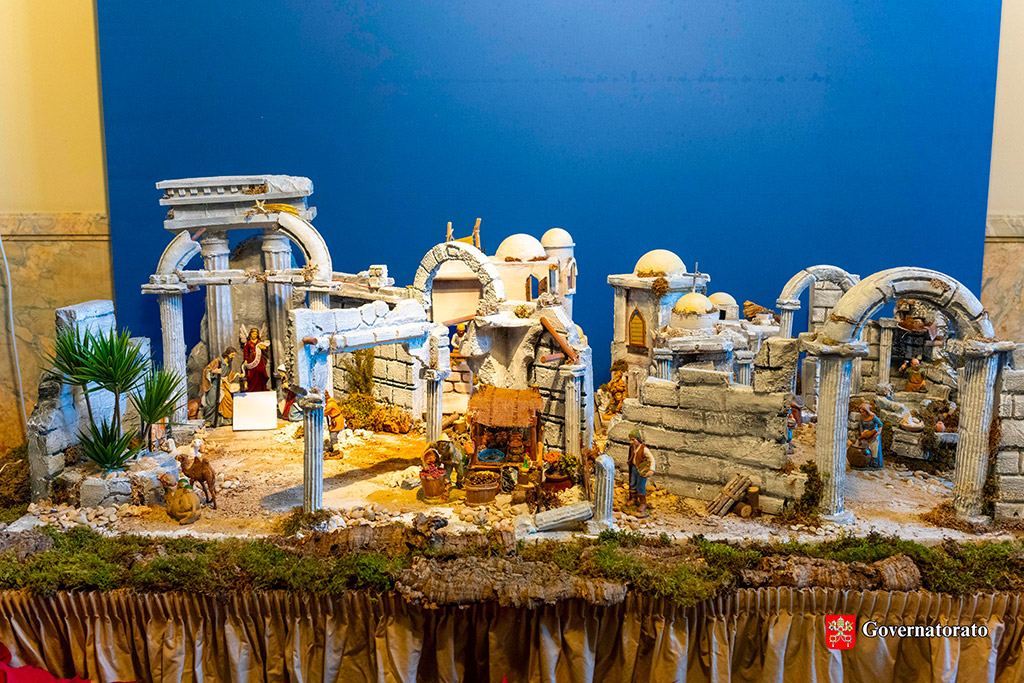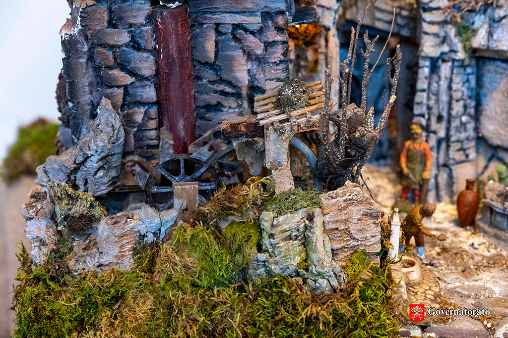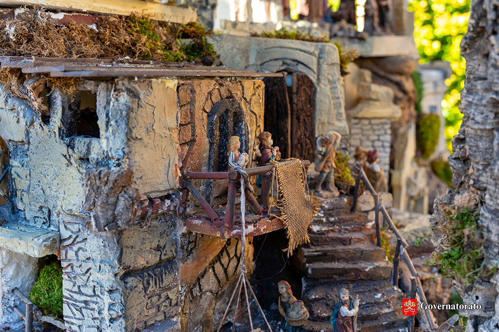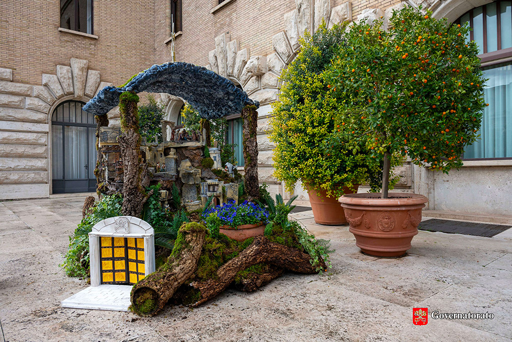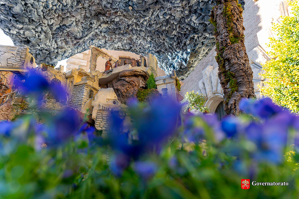 El Jubileo, con la representación de la Puerta Santa entreabierta, es el tema central de la escenificación de la Natividad, expuesta frente a la entrada del Palacio en la Gobernación. Se trata de un belén con una singularidad especial: puede contemplarse desde cualquier ángulo, ya que sus creadores —Augusto Minosse, Andrea Carlino y Fabio Frezza, del Servicio de Jardines y Medio Ambiente de la Dirección de Infraestructuras y Servicios— lo han concebido como una obra de 360 grados. La estructura se alza sobre una roca, en una colina elevada. Está protegida por una cubierta de madera y gomaespuma de colores. Justo debajo, se encuentra el grupo principal de María, José y el Niño, rodeados por pastores y Reyes Magos.