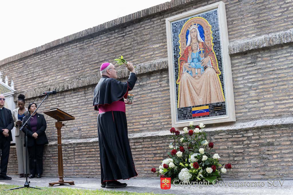 Lors d’une cérémonie qui s’est tenue dans la matinée du lundi 20 octobre — au lendemain de la canonisation des deux premiers saints vénézuéliens, José Gregorio Hernández et Mère Carmen Rendiles Martínez — une mosaïque représentant Marie sur le trône avec l’Enfant a été dévoilée et bénie.