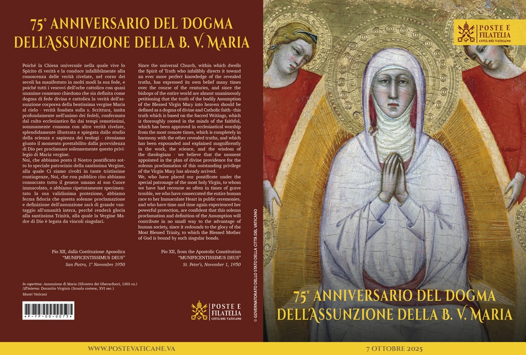 En 2025 sera célébré le 75ᵉ anniversaire de la proclamation solennelle du Dogme de l’Assomption de la Bienheureuse Vierge Marie. Pour rendre hommage à cet événement important, le Service de la Poste et de la Philatélie de la Direction des Télécommunications et des Systèmes informatiques du Gouvernorat a réalisé une émission commémorative spéciale unissant art, foi et collection.