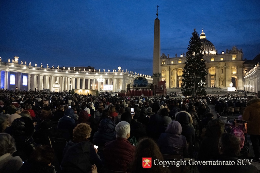 Les lumières illuminent le majestueux arbre de Noël et les voiles retirés révèlent la crèche artistique, au son de musiques et de chants traditionnels. Le moment est venu où fidèles et pèlerins peuvent admirer les installations de Noël sur la Place Saint-Pierre.