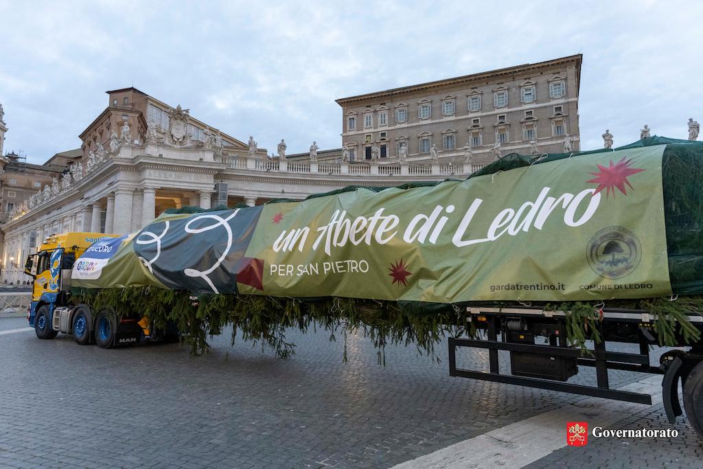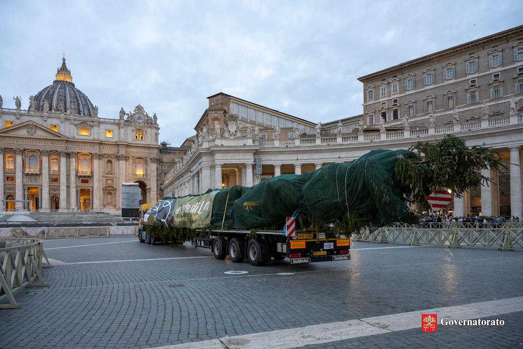 Questa mattina all'alba, giovedì 21 novembre, l'abete rosso di 29 metri, proveniente dal Comune trentino di Ledro è giunto in Piazza San Pietro, a bordo di un trasporto eccezionale, a cura della ditta Santoni.