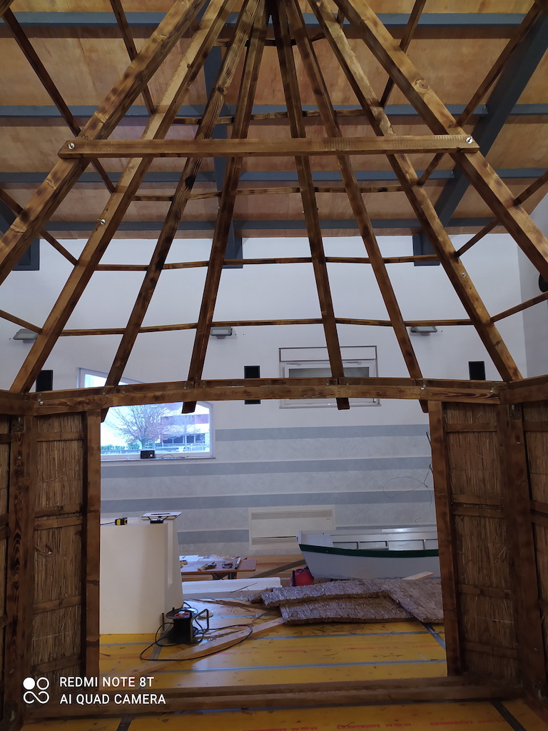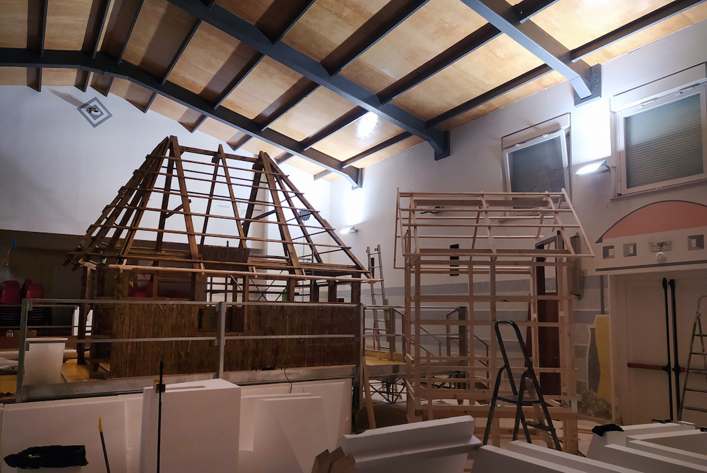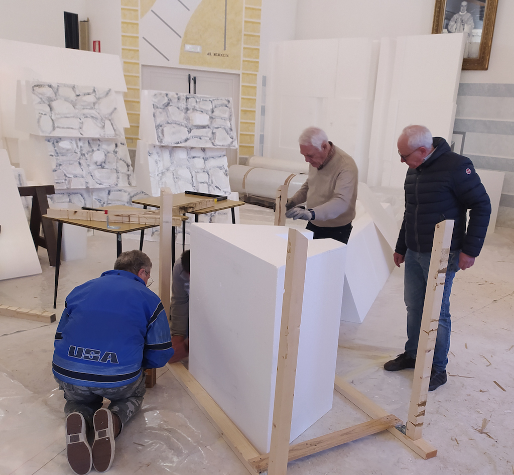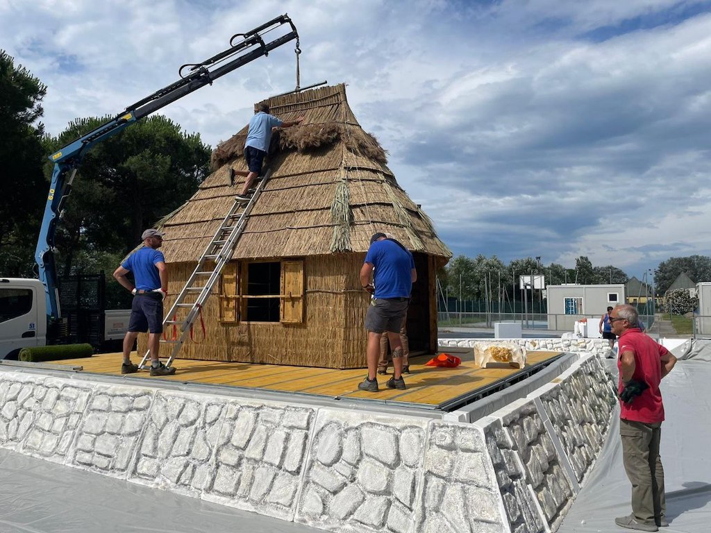 È importante evidenziare che tutti gli elementi sono stati pensati e ideati nelle loro dimensioni per essere montati e smontati facilmente per consentirne il loro inserimento nei containers ed essere trasportati da Grado a Piazza San Pietro e viceversa. Per fare degli esempi l’argine è composto da 102 pezzi di polistirolo modellati a mano per essere trasformati in rocce che formano l’argine; il casone grande da 18 pezzi, il locale di servizio da 12 pezzi e tanto altro.