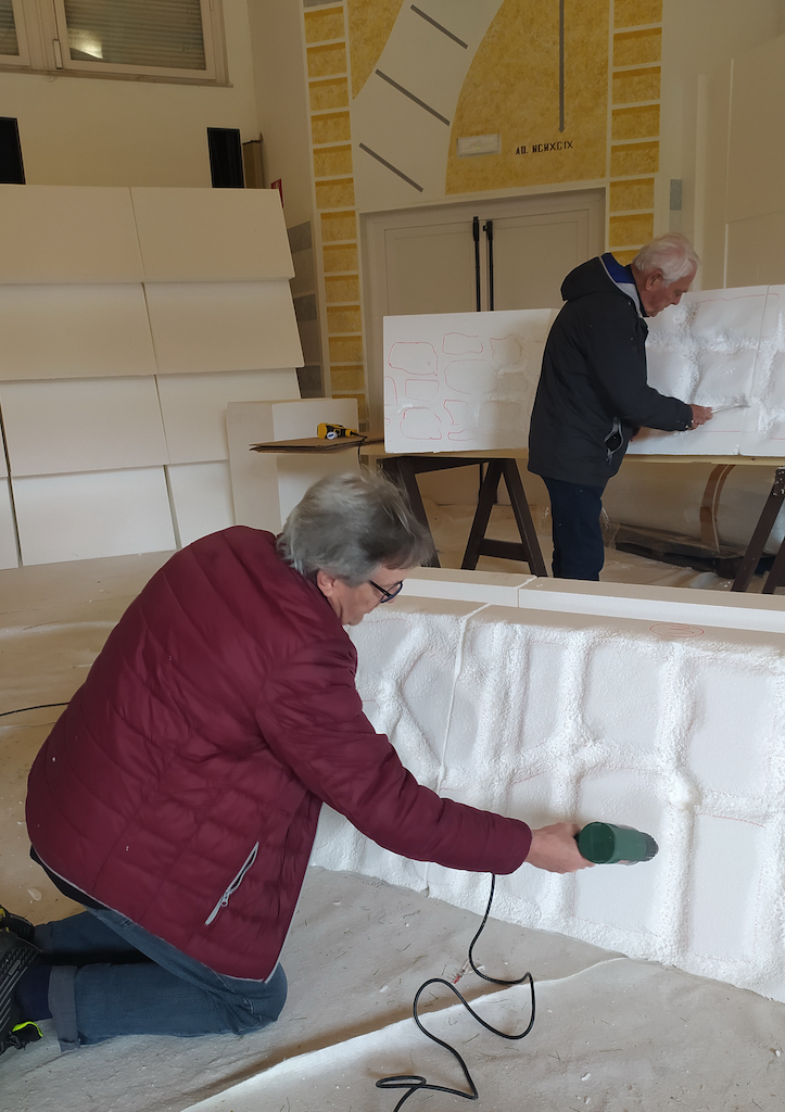 Inizialmente, quando si era in fase di progettazione ci si trovava nella sede dei Portatori della Madonna di Barbana presieduti da Adelchi Quargnali che per motivi di carattere burocratico-fiscale si sono assunti l’onere di fare da capofila. Poi tanti incontri e riunioni nelle proprie abitazioni e quindi i lavori più importanti nella Sala Fain del Ricreatorio Spes della parrocchia arcipretale di Grado guidata da monsignor Paolo Nutarelli. Infine, considerate le dimensioni, ci siamo spostati all’aperto nella pista di pattinaggio. Così tutti gli elementi del presepe hanno anche fatto la prova della resistenza alle intemperie meteorologiche.