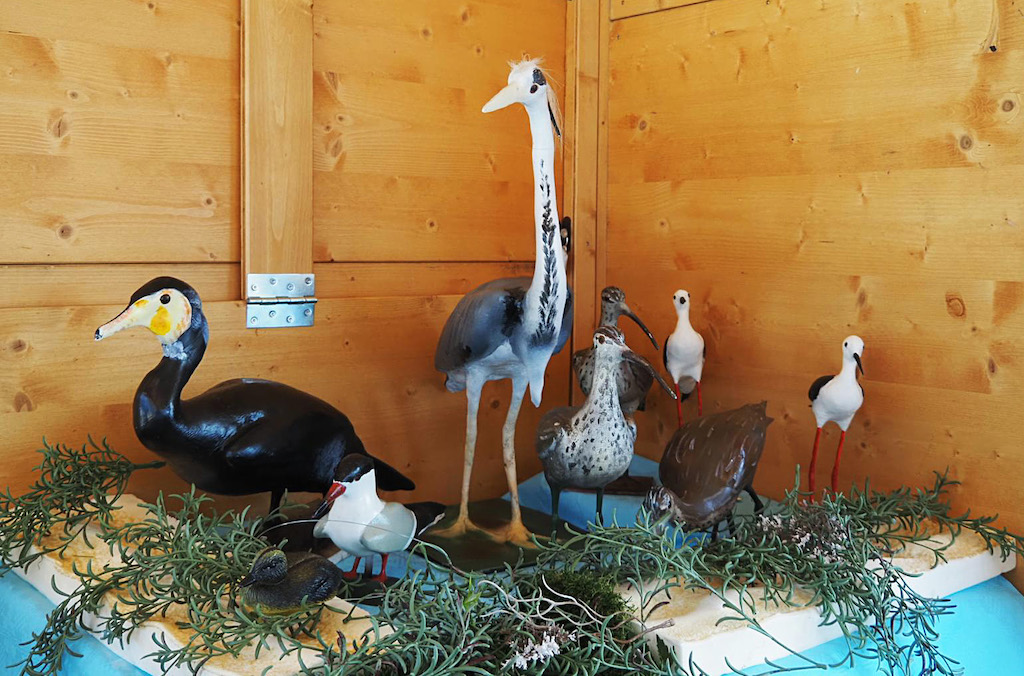 E poi le piante naturali anche di grandi dimensioni oltre a erba e fiori decorano l’ambiente. Anche l’avifauna lagunare è realizzata in plastica dipinta a mano con una stampante in 3D.