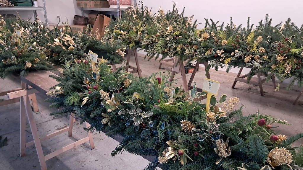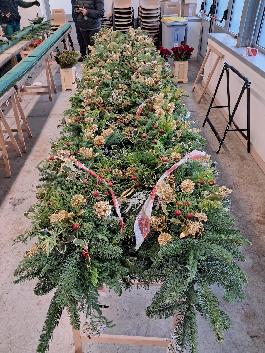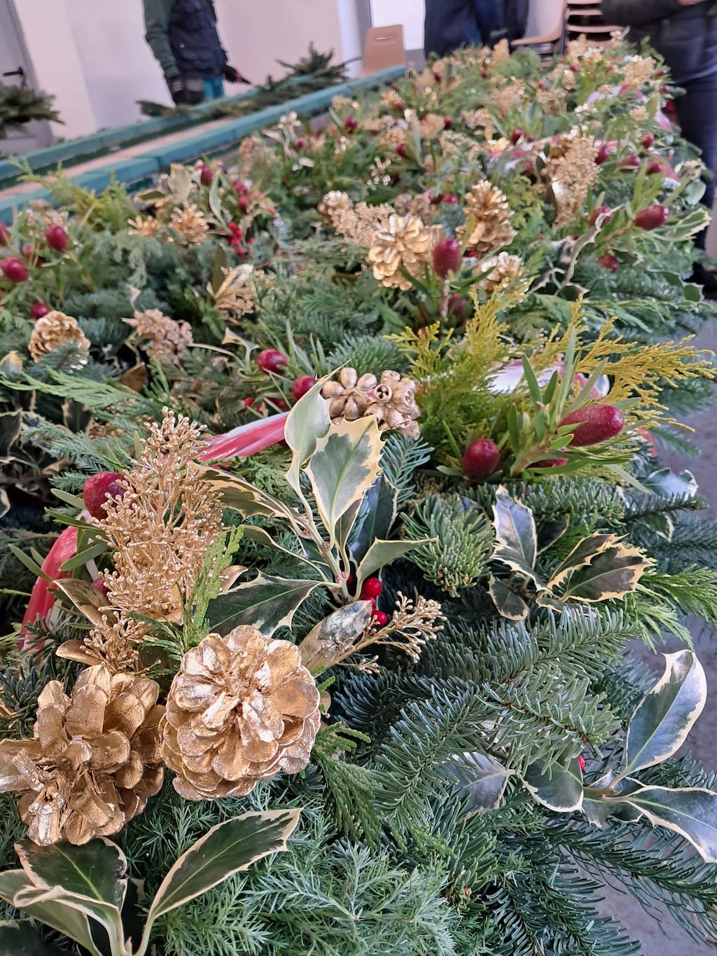 Nei cestelli vi sono stati inseriti dei rami di abete, delle rose rosse, delle pigne dorate, della tuya, e alcune decorazioni natalizie.