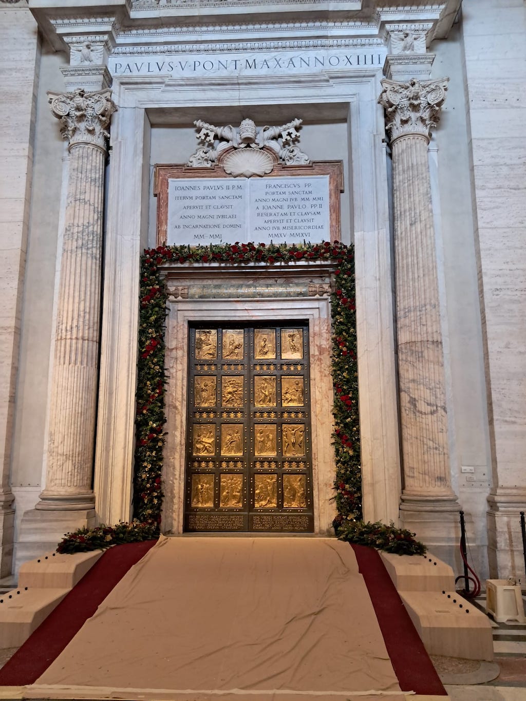 Una decorazione floreale adorna la Porta Santa. È stata preparata e installata dal Servizio Giardini e Ambiente del Governatorato dello Stato della Città del Vaticano.