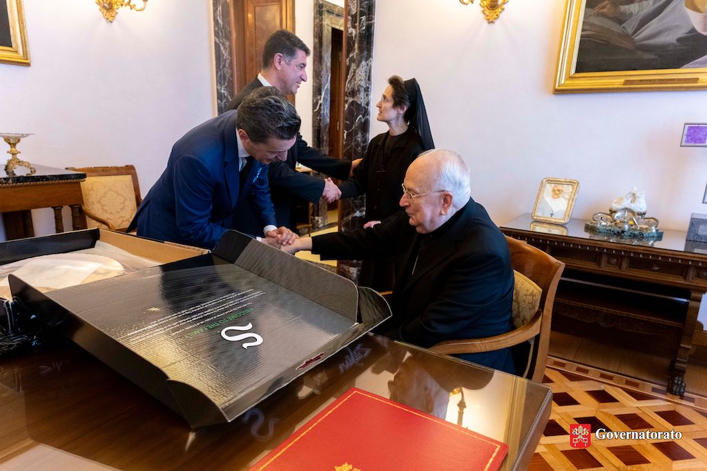 A consegnare gli strumenti, giovedì mattina, 27 febbraio, sono stati il Cardinale Fernando Vérgez Alzaga, Sr. Raffaella Petrini e Giuseppe Puglisi-Alibrandi, rispettivamente Presidente, Segretario e Vice-Segretario Generale. A riceverli, il maestro Stefano Iannilli e il Vice Commissario della Gendarmeria Mauro Colaiacomo, responsabile della disciplina e dell’impiego della Banda.