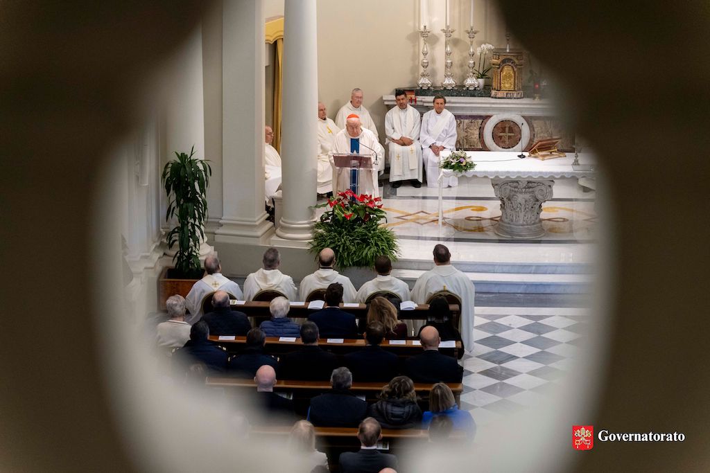 Ho scelto di darvi il mio ultimo saluto come Presidente del Governatorato, intorno alla Mensa eucaristica e, allo stesso tempo, celebrare anche l’inizio della missione che il Santo Padre ha affidato a Sr. Raffaella come Presidente della Pontificia Commissione per lo Stato della Città del Vaticano e Presidente del Governatorato. Saluto anche i due nuovi Segretari Generali, l’Arcivescovo Emilio Nappa e l’avvocato Giuseppe Puglisi-Alibrandi, che già conoscete. Questo perché ciò che nutre e rende feconda la nostra comunità di lavoro è il Signore. È nell'Eucaristia che il Corpo di Cristo trae forza e ragione di esistere. Ciò è a maggior ragione vero per noi che siamo direttamente al servizio del Successore di Pietro. Siamo chiamati a vivere la nostra professionalità in una realtà, che è funzionale allo svolgimento del ministero petrino e a unirci ancor di più a Cristo proprio per svolgere al meglio questa missione.