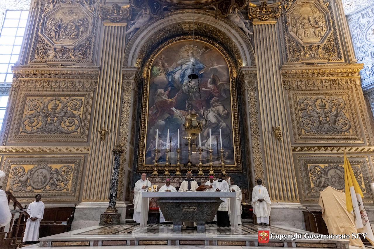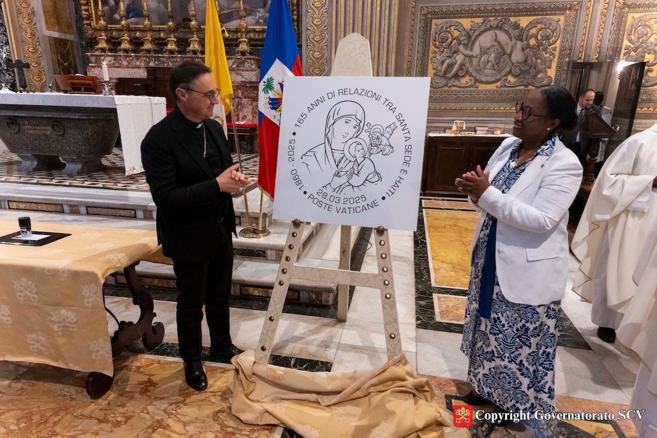 Nel pomeriggio, nella cappella del Coro della Basilica di San Pietro, il Cardinale Peter Kodwo Appiah Turkson, Cancelliere della Pontificia Accademia delle Scienze e della Pontificia Accademia delle Scienze Sociali, ha presieduto la concelebrazione eucaristica. Successivamente, l’Arcivescovo Emilio Nappa, Segretario Generale del Governatorato, insieme con l’Incaricata d’affari dell’Ambasciata di Haiti presso la Santa Sede, Sig.ra Marie Guerlyne Janvier, ha svelato l’annullo postale speciale, in occasione del 165° anniversario del concordato tra la Santa Sede e la Repubblica di Haiti. L’annullo riproduce un particolare dell’effigie di Nostra Signora del Perpetuo Soccorso, con l’angelo che mostra al Bambino gli strumenti della Passione. Completano l’annullo le scritte “165 Anni di relazioni tra Santa Sede e Haiti”, “28.03.2025” e “Poste Vaticane”. Era presente anche l’ingegner Antonino Intersimone, Direttore della Direzione delle Telecomunicazioni e dei Sistemi Informatici.