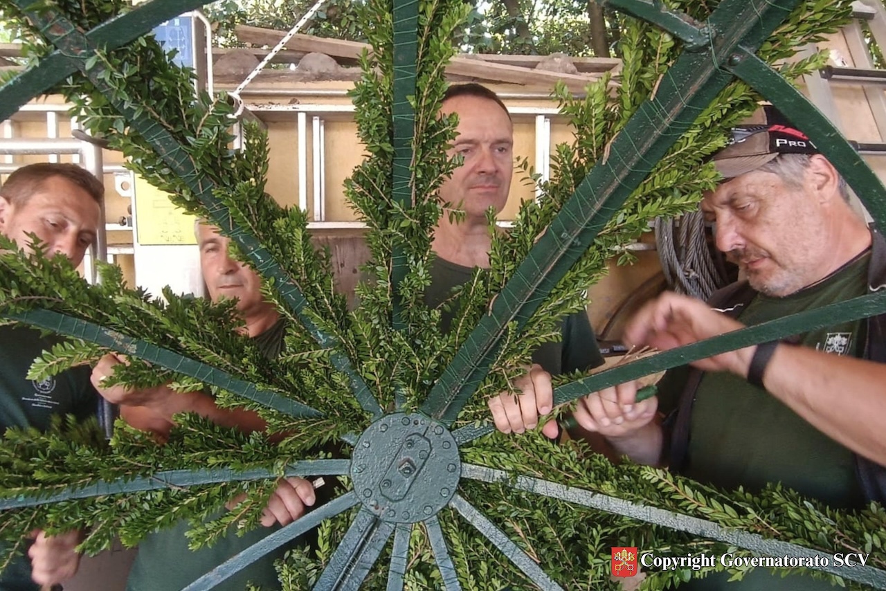 La realizzazione richiede un grande impegno e coinvolge circa dieci persone. Il lavoro inizia circa una settimana prima del 29 giugno, con la raccolta del mirto tarantino, che cresce abbondante ai margini del bosco nei Giardini Vaticani. Una volta raccolto, il fogliame viene trasportato nella sede centrale del servizio, dove viene selezionato e lavato. Le foglie troppo tenere vengono eliminate con delle forbici, poiché tenderebbero a marcire in breve tempo.