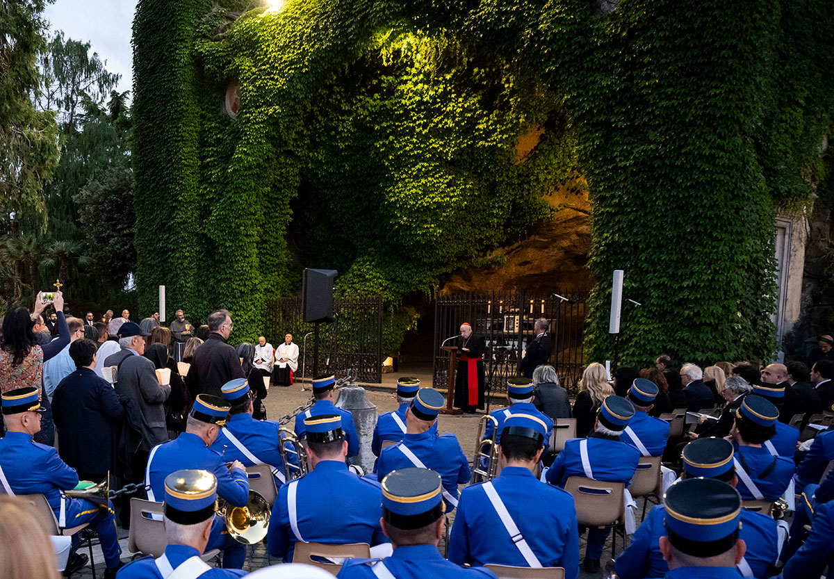 Davanti alla Grotta di Lourdes, preghiamo anche per Papa Francesco e per il suo ministero nella Chiesa. Chiediamo alla Vergine di proteggerlo con la sua benedizione e chiediamo che protegga anche noi, le nostre famiglie, i nostri cari, e quanti sono alla ricerca di Dio.