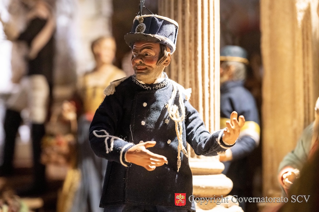 Tre Gendarmi con indosso le uniformi — una appartenente alla storica Gendarmeria Pontificia e le altre all’attuale Corpo vaticano — dialogano tra loro sul lato sinistro del Presepe, creando un filo ideale che attraversa le epoche. Esse raccontano una continuità fatta di lealtà e dedizione alla Chiesa, un impegno che non conosce interruzioni.