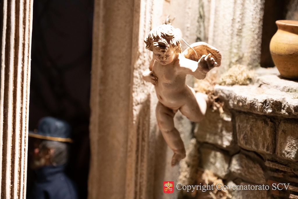 Si rivolge a chiunque si avvicini, invitando a contemplare il mistero della nascita di Gesù. È un musicista della Banda del Corpo della Gendarmeria, che sta in piedi, rivolto verso l’esterno del Presepe. Si unisce al coro degli Angeli nell’accompagnare il canto del Venite Adoremus. Con la musica rompe il silenzio della notte per far conoscere a tutti la notizia più sconvolgente: il Signore è nato a Betlemme dalla Vergine Maria.