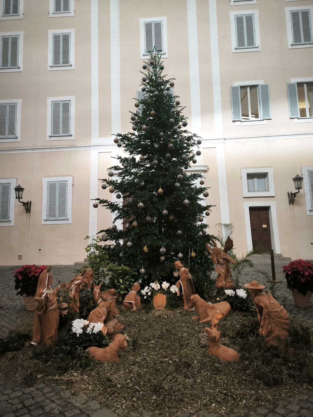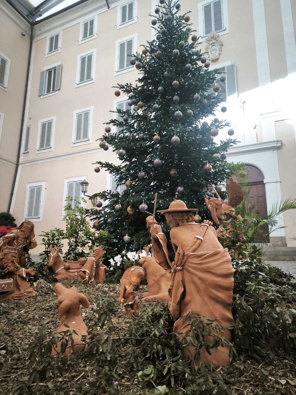 Un’esplosione di calore, fede e tradizione popolare, intorno al grande albero di Natale, collocato al centro del Cortile del Palazzo Apostolico di Castel Gandolfo. Figure modellate a mano in terracotta ricordano la nascita di Gesù. Si tratta di un presepe messicano, con un numero di personaggi essenziale: il Bambino, Maria, Giuseppe, i tre Magi, un pastore e un angelo. Hanno forme semplici ma molto espressive: volti assorti a contemplare il mistero, tutti protesi verso la mangiatoia circondata dal bue e l’asinello.