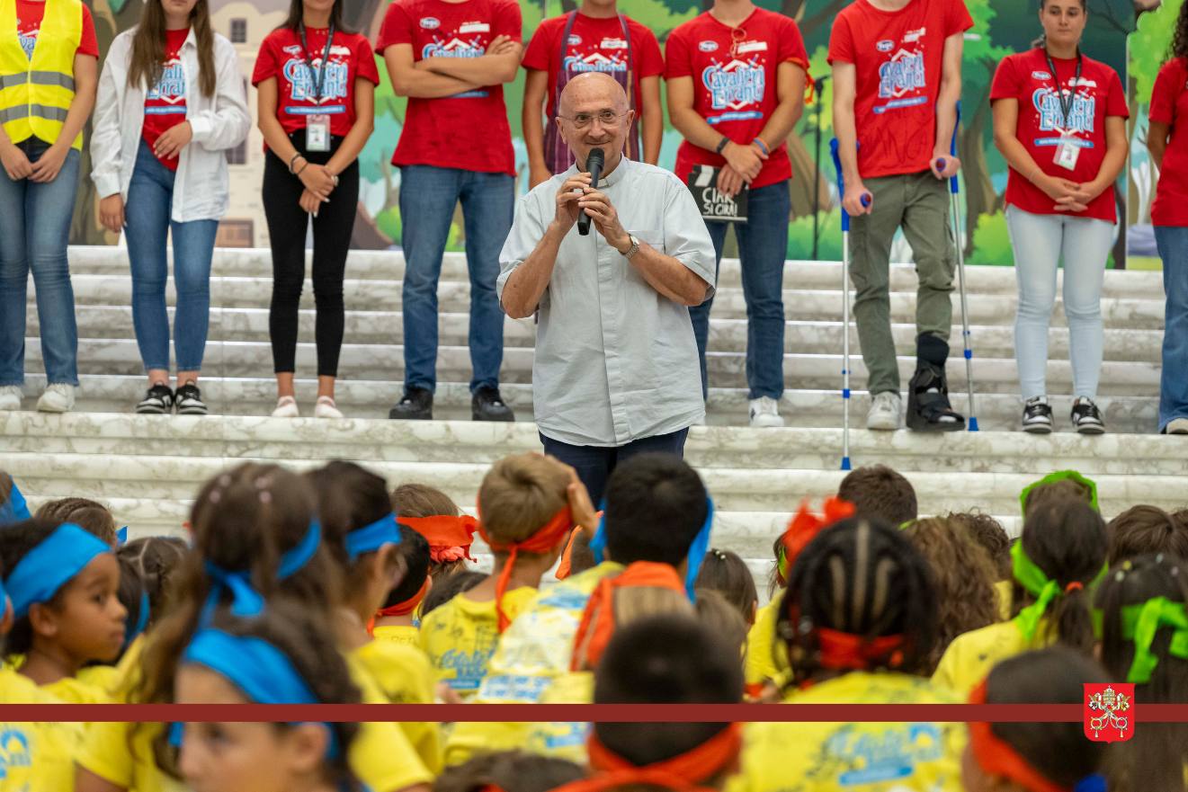 Uno spettacolo con canti, balli, musica e un’esplosione di gioia ed entusiasmo. Come tanti Cavalieri erranti, i piccoli che hanno partecipato all’Estate Ragazzi in Vaticano sono giunti al termine del loro percorso. Per salutarsi hanno scelto di organizzare una festa. Così, giovedì pomeriggio, 25 luglio, si sono ritrovati nell’Aula Paolo VI e hanno invitato il Cardinale Fernando Vérgez Alzaga, Suor Raffaella Petrini, rispettivamente Presidente e Segretario Generale del Governatorato dello Stato della Città del Vaticano, insieme con genitori, parenti e amici. All’inizio, il Cardinale ha rivolto un breve saluto ai ragazzi e alle ragazze e ha scherzato con loro.
