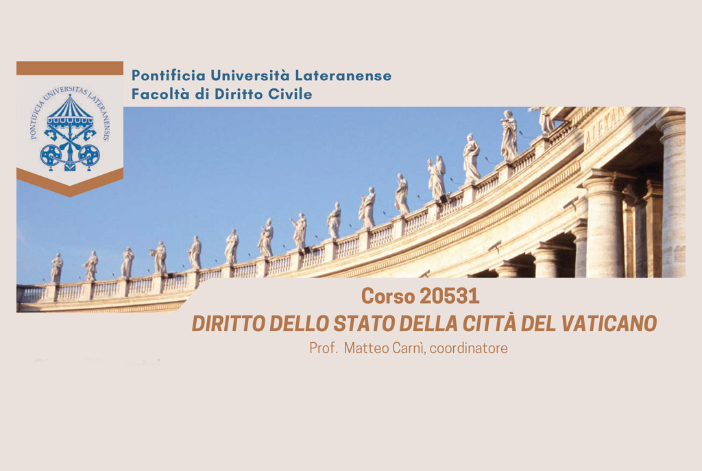 Si svolge da lunedì 23 febbraio a mercoledì 27 maggio, alla Pontificia Università Lateranense, il corso sul tema “Diritto dello Stato della Città del Vaticano” coordinato da Matteo Carnì, professore invitato presso la Facoltà di Diritto Civile della stessa Pontificia Università.