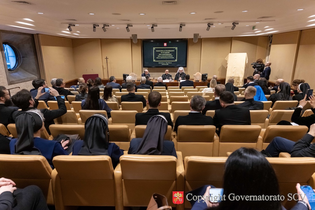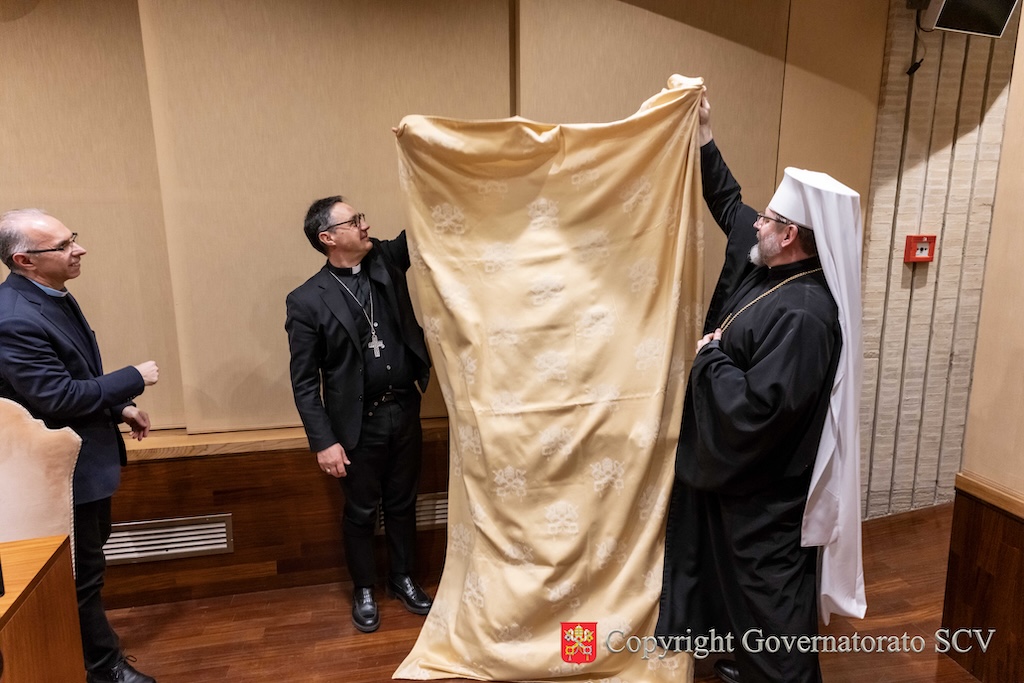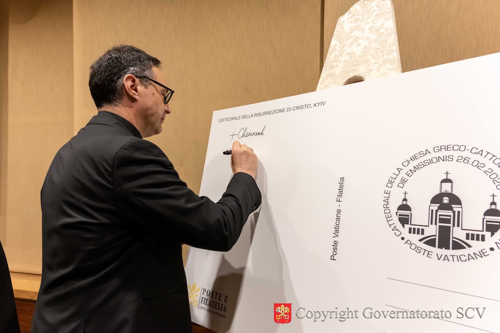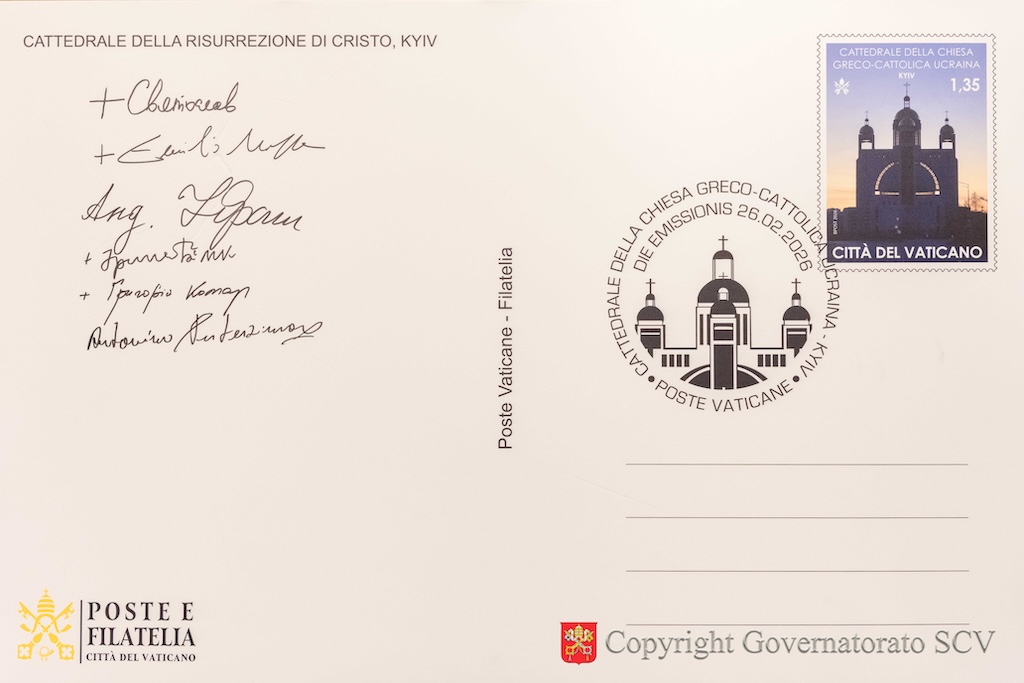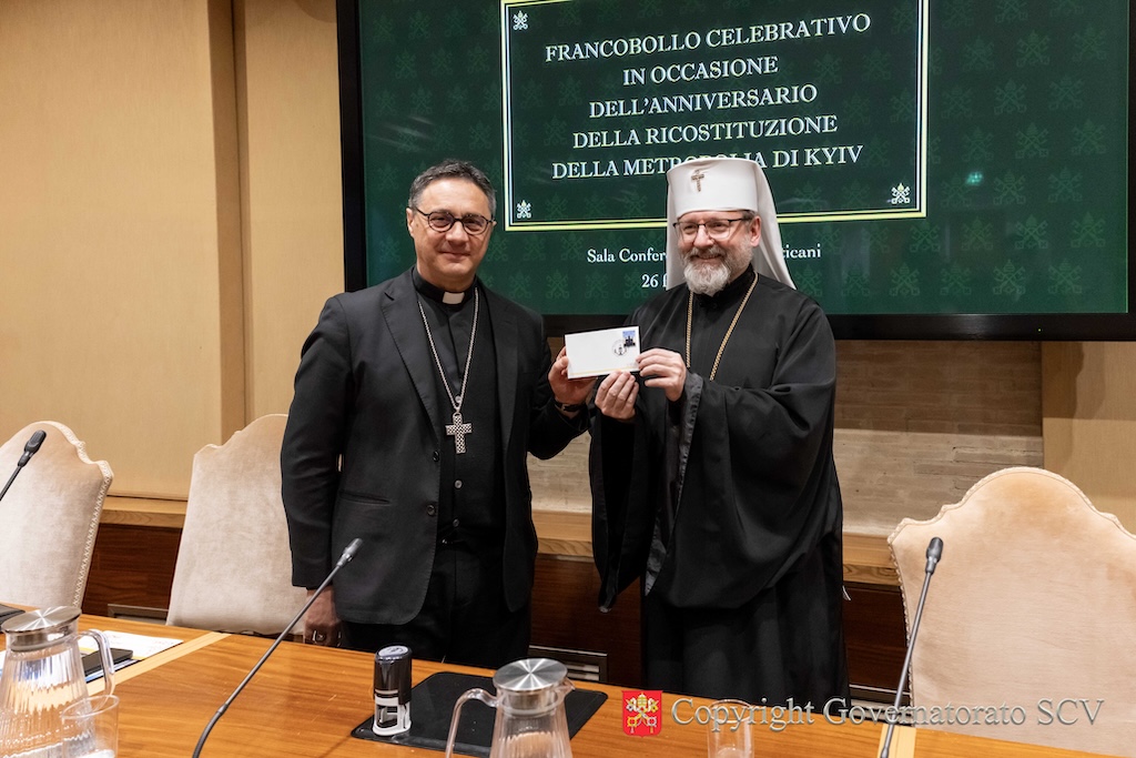 A presentare le nuove emissioni sono stati Sua Beatitudine Sviatoslav Shevchuk, Arcivescovo maggiore di Kyiv-Halyč, Padre e Capo della Chiesa greco-cattolica ucraina, e l’Arcivescovo Emilio Nappa, Segretario Generale del Governatorato dello Stato della Città del Vaticano. La presentazione si è svolta, giovedì pomeriggio, 26 febbraio, nella Sala Conferenze dei Musei Vaticani, alla presenza del Vescovo Hryhoriy Komar, Amministratore Apostolico “sede vacante et ad nutum Sanctae Sedis” per i fedeli cattolici ucraini di rito bizantino residenti in Italia, di Monsignor Irynej Bilyk, Vescovo emerito dell’Eparchia di Bucac della Chiesa greco-cattolica ucraina, di S.E. il signor Francesco Di Nitto. Ambasciatore d’Italia presso la Santa Sede, di S.E. il signor Andrii Yurash, Ambasciatore di Ucraina presso la Santa Sede, di S.E. il signor Antonio Zanardi Landi di Veano, Ambasciatore del Sovrano Militare Ordine di Malta presso la Santa Sede, dell’ingegner Antonino Intersimone, Direttore della Direzione delle Telecomunicazioni e dei Sistemi Informatici, di don Felice Bruno, Capo Ufficio del Servizio Poste e Filatelia, di alcuni prelati e numerosi religiosi e religiose.