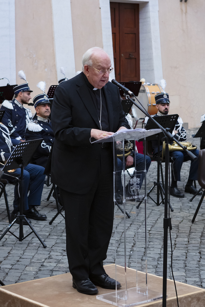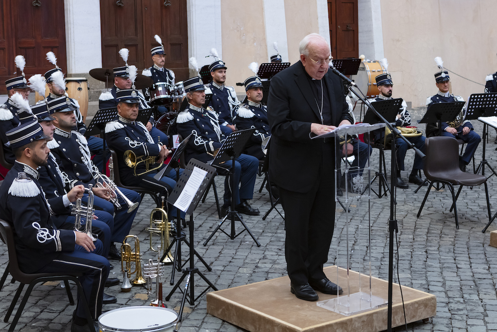 È un grande piacere per me essere tra voi questa sera in occasione di questo Concerto tenuto dalla Banda musicale del Corpo della Gendarmeria e promosso dalla Direzione dei Musei e dei Beni Culturali e dalla Direzione delle Ville Pontificie. Si svolge nella festa dei Santi Arcangeli Michele, Gabriele e Raffaele, dato che Michele è il Patrono della Gendarmeria.