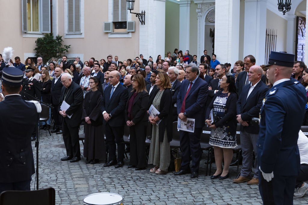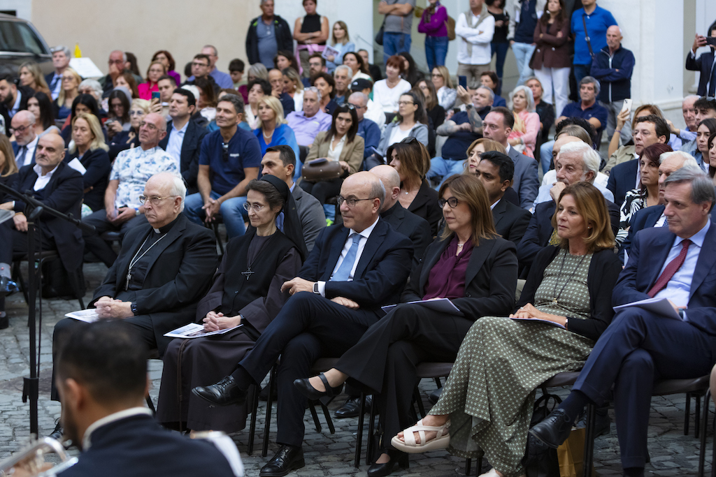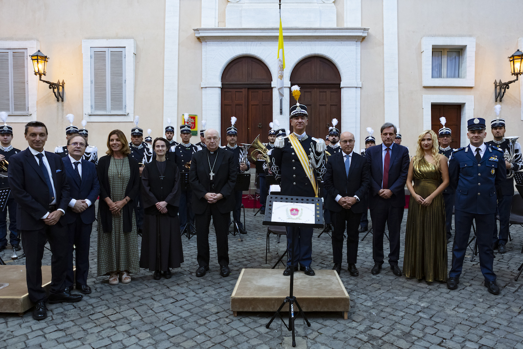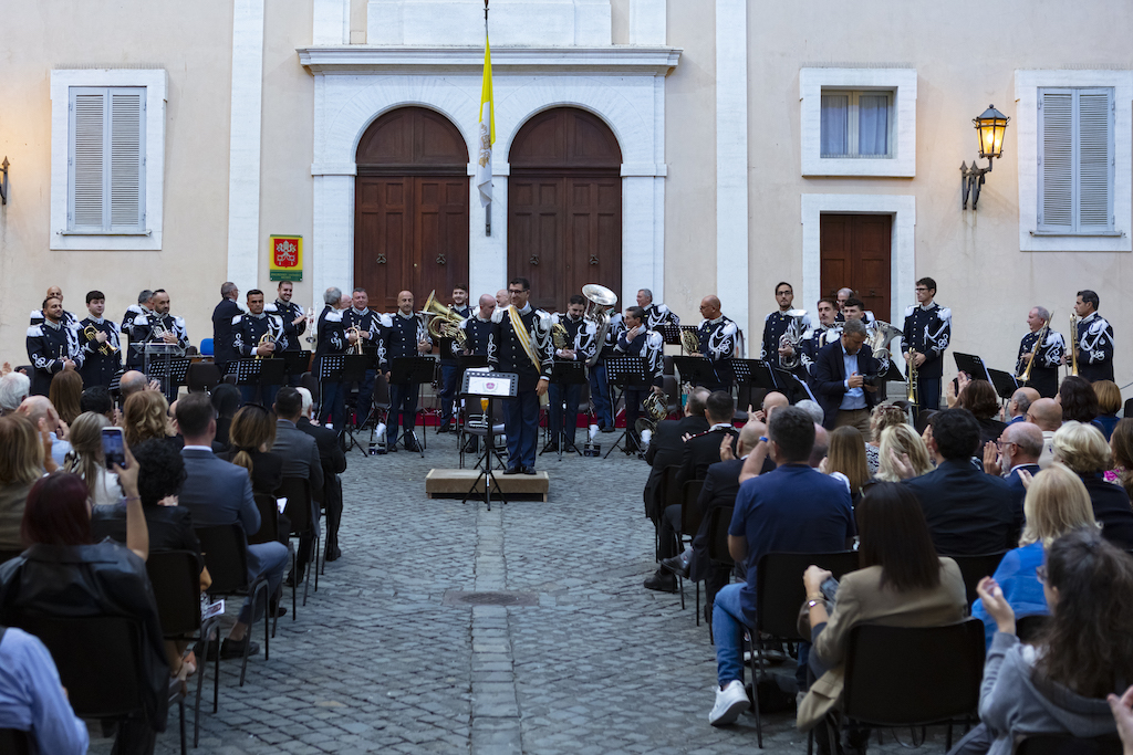 Al concerto erano presenti, tra gli altri, il Cardinale Fernando Vérgez Alzaga, Sr. Raffaella Petrini, e Giuseppe Puglisi-Alibrandi, rispettivamente Presidente, Segretario Generale e Vice Segretario Generale del Governatorato dello Stato della Città del Vaticano, l’Arcivescovo Giordano Piccinotti, Presidente dell’Amministrazione del Patrimonio della Sede Apostolica, Barbara Jatta, Direttore della Direzione dei Musei e dei Beni Culturali, Andrea Tamburelli, Direttore della Direzione delle Ville Pontificie, Andrea Arcangeli, Direttore della Direzione di Sanità e Igiene, fra Thomas Binish Mulackal, Direttore della Farmacia Vaticana, padre Gabriele Gionti, vice-Direttore per Castel Gandolfo della Specola Vaticana, Enrico Bartelucci, vice direttore della Direzione dell’Economia, Davide Acquaviva comandante della compagnia dei Carabinieri di Castel Gandolfo, e Massimiliano Profili, direttore della fanfara della Polizia di Stato.