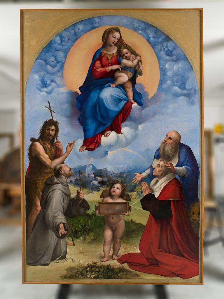 La Vergine dipinta è meravigliosa e certamente ispira. Era concepita per un segretario di Giulio II, poi di Leone X, i Papi di Raffaello. Si chiamava Sigismondi de’ Conti e l’aveva commissionata per la cappella gentilizia in Santa Maria in Aracoeli. L’opera è passata di mano in mano, fino a quando, una sua nipote entrò in un monastero di clausura a Foligno e lì rimase fino alle campagne napoleoniche di fine XVIII secolo.