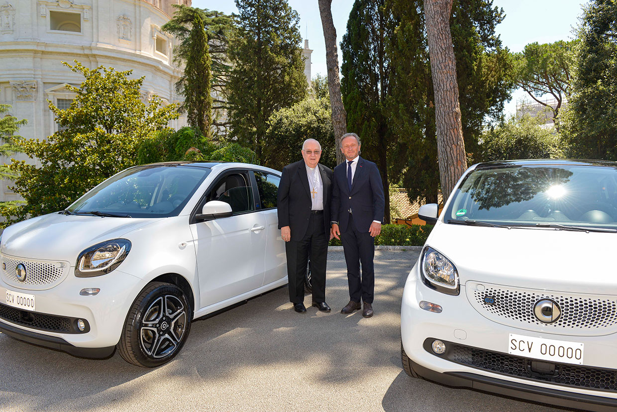 Le due citycar 100% elettriche, concesse in comodato gratuito per cinque anni da Daimler AG, sottolineano ancora una volta l'evoluzione verso un modello di mobilità sostenibile, un’azione chiave per accogliere l'appello a salvaguardia del Pianeta lanciato da Papa Francesco nel 2015 con l'Enciclica Laudato si’.